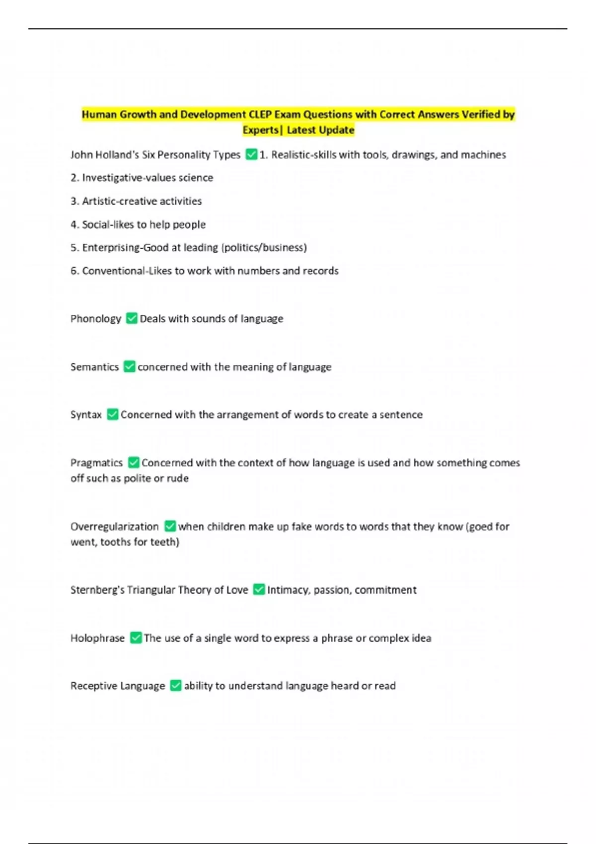 Human Growth and Development CLEP Exam Questions with Correct Answers Verified by Experts| Latest Update