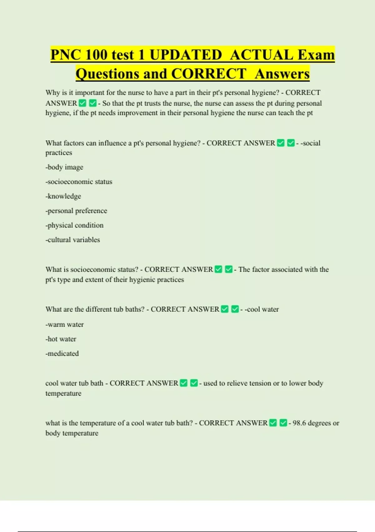 PNC 100 test 1 UPDATED ACTUAL Exam Questions and CORRECT Answers Why is it important for the nurse to have a part in their pt's personal hygiene? - CORRECT ANSWER - So that the pt trusts the nurse, the nurse can assess the pt during personal hygiene, if the pt needs improvement in their personal hygiene the nurse can teach the pt What factors can influence a pt's personal hygiene? - CORRECT ANSWER practices -body image -socioeconomic status -knowledge -personal preference -physical condition -cultural var