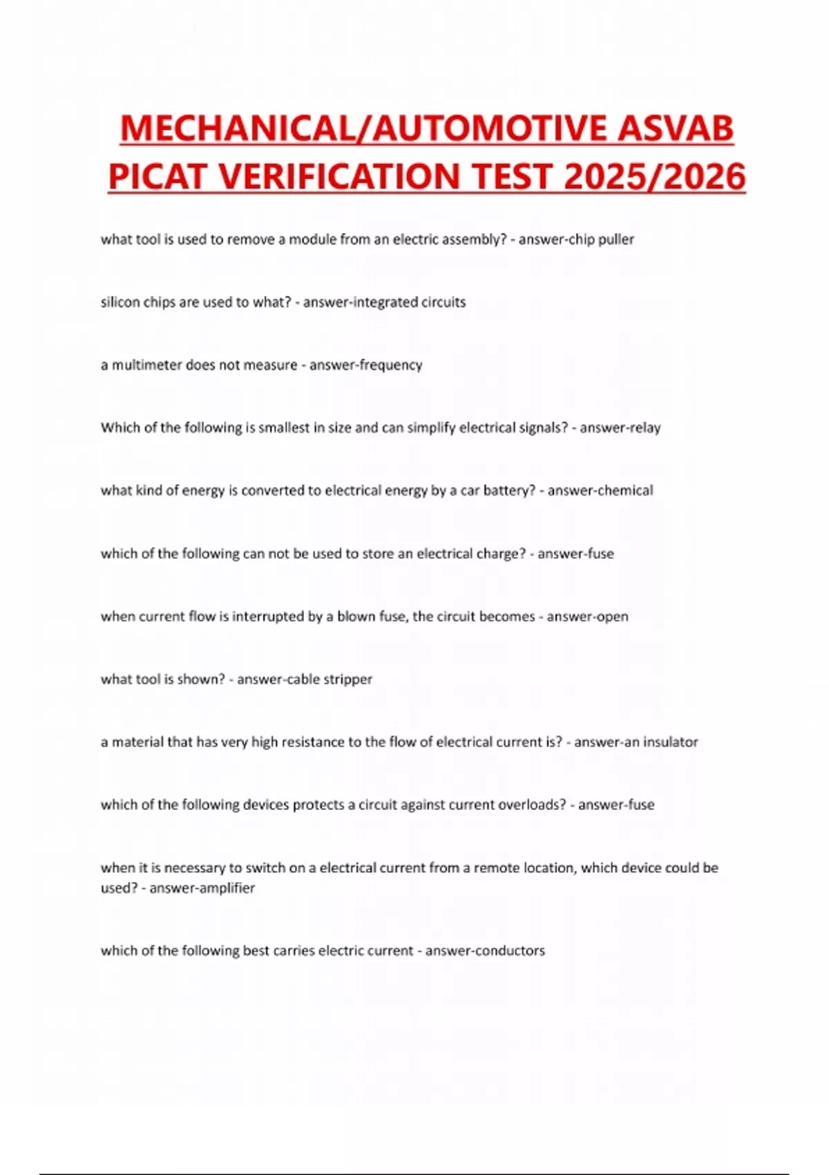 MECHANICAL/AUTOMOTIVE ASVAB PICAT VERIFICATION TEST 2025/2026 what tool is used to remove a module from an electric assembly? - answer-chip puller silicon chips are used to what? - answer-integrated circuits a multimeter does not measure - answer-frequency Which of the following is smallest in size and can simplify electrical signals? - answer-relay what kind of energy is converted to electrical energy by a car battery? - answer-chemical which of the following can not be used to store an electrical charge? - answer-fuse