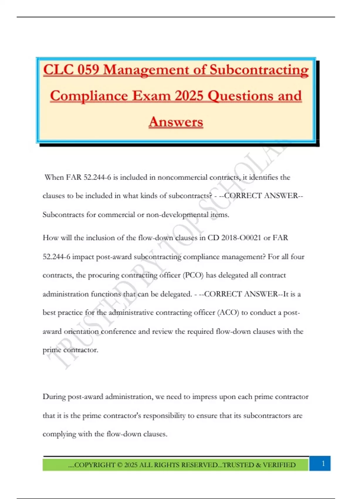 CLC 059 Management of Subcontracting Compliance Exam 2025 Questions and Answers
