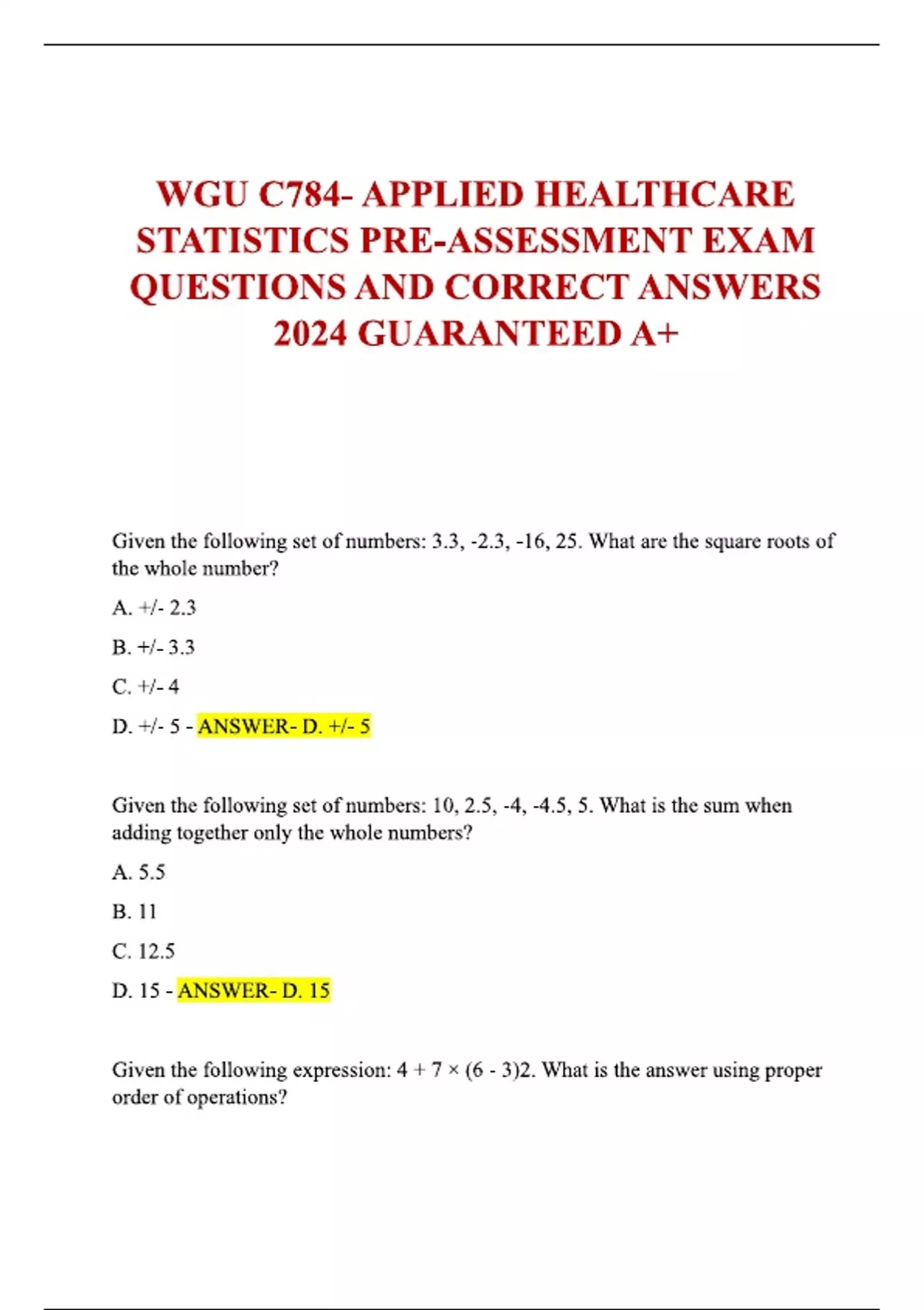 WGU C784- APPLIED HEALTHCARE STATISTICS PRE-ASSESSMENT EXAM QUESTIONS AND CORRECT ANSWERS