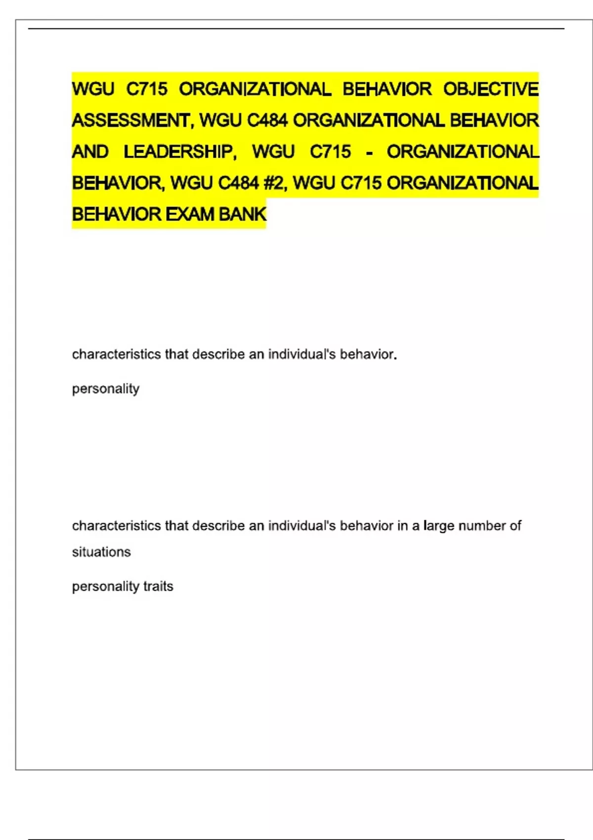 WGU C715 & WGU C484 ORGANIZATIONAL BEHAVIOR AND LEADERSHIP OBJECTIVE QUESTIONS AND VERIFIED ANSWERS 100% CORRECT