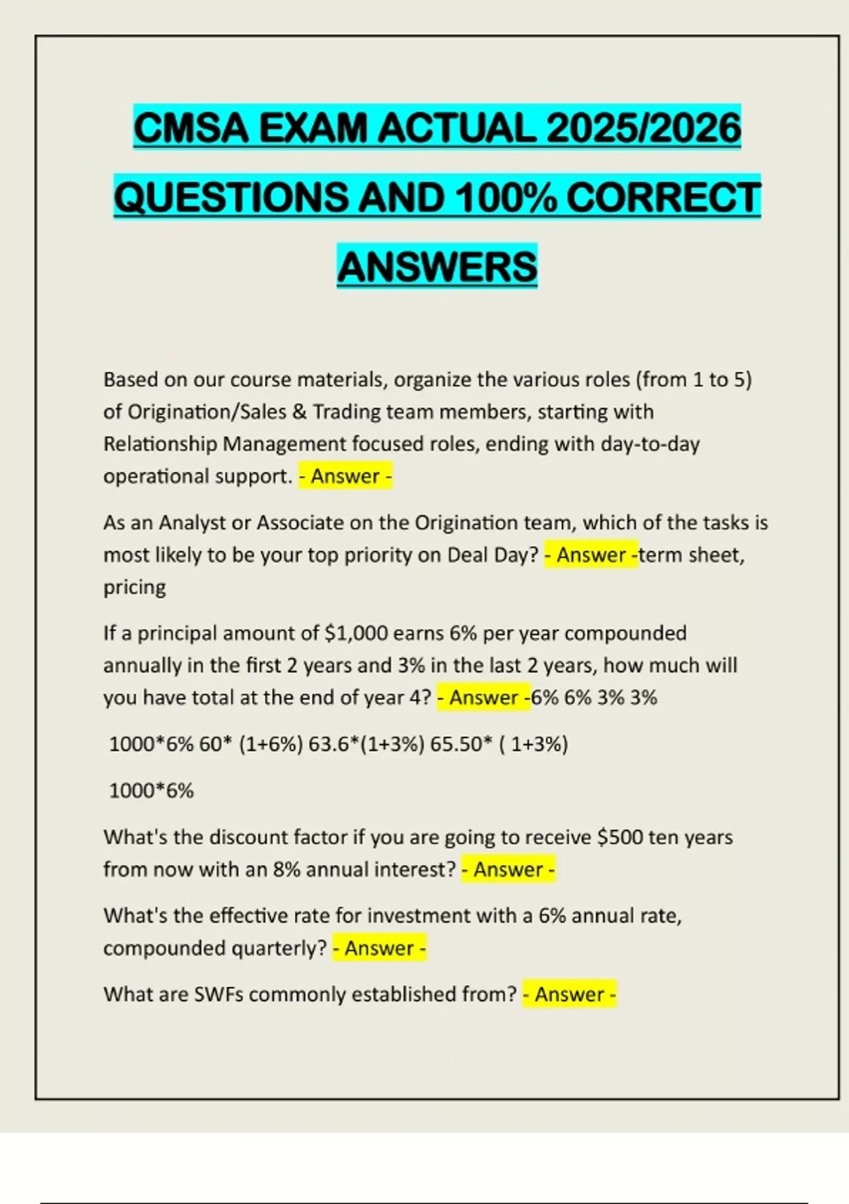 CMSA EXAM ACTUAL 2025/2026 QUESTIONS AND 100% CORRECT ANSWERS Based on our course materials, organize the various roles (from 1 to 5) of Origination/Sales & Trading team members, starting with Relationship Management focused roles, ending with day-to-day operational support. - Answer - As an Analyst or Associate on the Origination team, which of the tasks is most likely to be your top priority on Deal Day? - Answer -term sheet, pricing If a principal amount of $1,000 earns 6% per year compounded annually in the first 2 years and 3% in the last 2 years, how much will you have total at the end of year 4? - Answer -6% 6% 3% 3% 1000*6% 60* (1+6%) 63.6*(1+3%) 65.50* ( 1+3%) 1000*6% What's the discount factor if you are going to receive $500 ten years from now with an 8% annual interest? - Answer - What's the effective rate for investment with a 6% annual rate, compounded quarterly? - Answer - What are SWFs commonly established from? - Answer -How does an increase in the Central Bank's policy rate effect it's domestic bond market - Answer - What is not true about fiat money? - Answer - What's the best way to manage the situation where individuals rationalize committing misconduct in an organization? - Answer - If a company declares bankruptcy, what is the correct order of how stakeholders are paid out (from first to last)? - Answer - What is the spread for this security after an investor submits a sell order for 185 shares at $41.87? - Answer - Decide whether Company A is a buy or sell depending on the following information: Company A: P/E Ratio: 8.12x Share Price: $29.08