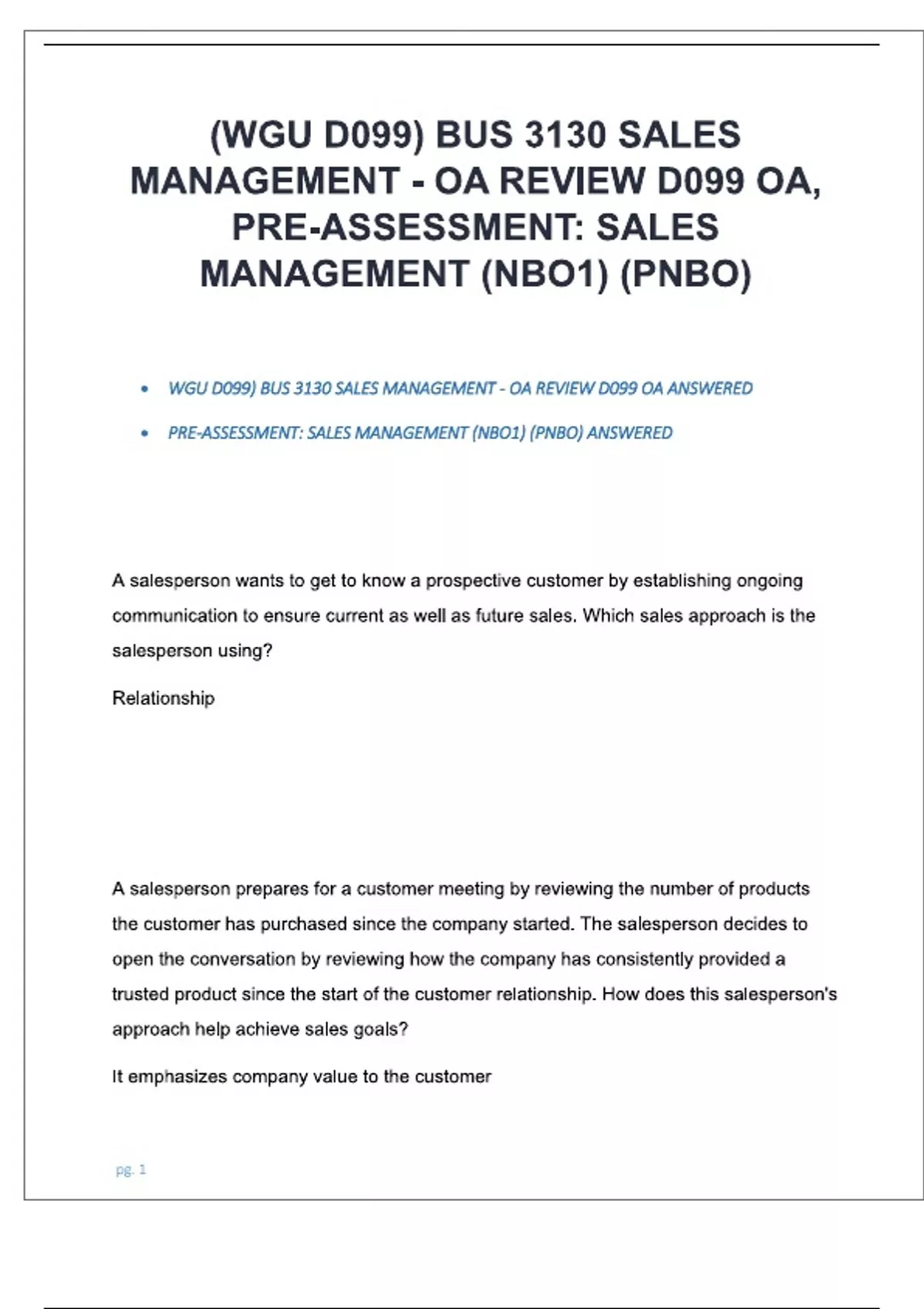 (WGU D099) BUS 3130 SALES MANAGEMENT - OA REVIEW, PRE-ASSESSMENT SALES MANAGEMENT QUESTIONS AND VERIFIED ANSWERS 100% CORRECT