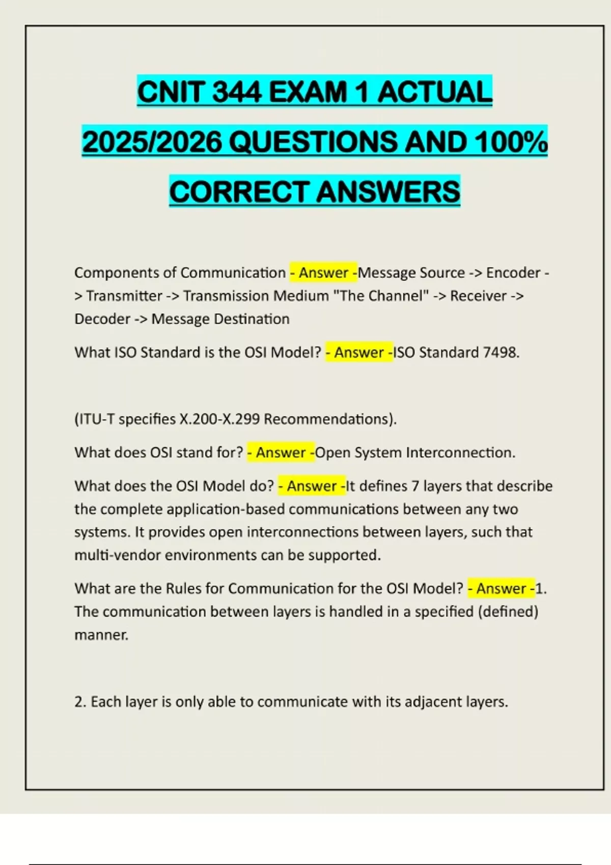 CNIT 344 EXAM 1 ACTUAL 2025/2026 QUESTIONS AND 100% CORRECT ANSWERS Components of Communication - Answer -Message Source -> Encoder - > Transmitter -> Transmission Medium "The Channel" -> Receiver -> Decoder -> Message Destination What ISO Standard is the OSI Model? - Answer -ISO Standard 7498. (ITU-T specifies X.200-X.299 Recommendations). What does OSI stand for? - Answer -Open System Interconnection. What does the OSI Model do? - Answer -It defines 7 layers that describe the complete application-based communications between any two systems. It provides open interconnections between layers, such that multi-vendor environments can be supported. What are the Rules for Communication for the OSI Model? - Answer -1. The communication between layers is handled in a specified (defined) manner. 2. Each layer is only able to communicate with its adjacent layers.3. Each layer relies on the layers below it to perform their specified function. 4. Each layer relies on the layers above it to perform their specified function. What are some benefits to the OSI Model? - Answer -1. Breaks network communication into smaller, more manageable parts. Prevents changes in one layer from affecting other layers. 2. Standardizes network components to allow multiple vendor development and support. 3. Allows different types of network hardware and so