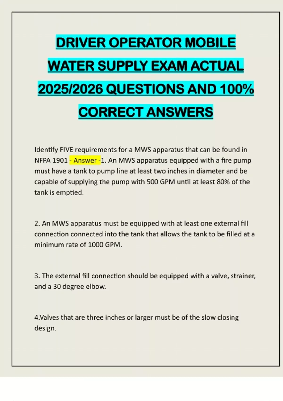 DRIVER OPERATOR MOBILE WATER SUPPLY EXAM ACTUAL 2025/2026 QUESTIONS AND 100% CORRECT ANSWERS Identify FIVE requirements for a MWS apparatus that can be found in NFPA 1901 - Answer -1. An MWS apparatus equipped with a fire pump must have a tank to pump line at least two inches in diameter and be capable of supplying the pump with 500 GPM until at least 80% of the tank is emptied. 2. An MWS apparatus must be equipped with at least one external fill connection connected into the tank that allows the tank to be filled at a minimum rate of 1000 GPM. 3. The external fill connection should be equipped with a valve, strainer, and a 30 degree elbow. 4.Valves that are three inches or larger must be of the slow closing design.5. An MWS apparatus must have at least three large tank discharges capable of discharging 90% of the tank volume at an average of 1000 GPM. When Checking the left front or right front side of the fire apparatus, don't forget to inspect the: - Answer -saddle tanks Daily inspection - Answer -Ensure auxiliary fuel tank is full Operate pump primer Inspect auxiliary winterization system. Weekly Inspection - Answer -Clean intake strainers Pre-service pump certification test are conducted by: - Answer -An independent testing agency When using a static body of water as your water source during fire apparatus service testing, the water surface must not be more than___ feet above the centerline of the pump intake and the water must be at least _____ feet deep. - Answer -10 Feet above 4 Feet deep If the engine speed check proves the MWS apparatus is running at a different speed than what which it was originally rated, you need to? - Answer -Stop the testing until the problem is corrected.A year has passed and its time conduct the annual vacuum tes
