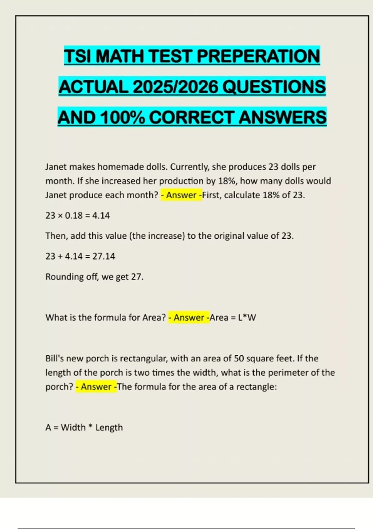 TSI MATH TEST PREPERATION ACTUAL 2025/2026 QUESTIONS AND 100% CORRECT ANSWERS Janet makes homemade dolls. Currently, she produces 23 dolls per month. If she increased her production by 18%, how many dolls would Janet produce each month? - Answer -First, calculate 18% of 23. 23 × 0.18 = 4.14 Then, add this value (the increase) to the original value of 23. 23 + 4.14 = 27.14 Rounding off, we get 27. What is the formula for Area? - Answer -Area = L*W Bill's new porch is rectangular, with an area of 50 square feet. If the length of the porch is two times the width, what is the perimeter of the porch? - Answer -The formula for the area of a rectangle: A = Width * LengthFrom the question we know that L = 2W and that A = 50. So we can plug these values into our equation and solve for W: 50 = W * L 50 = W * 2W 50 = 2W² W² = 25 W = 5 We know that L = 2W, so L = 10 Perimeter = 2L + 2W Perimeter = 2 * 10 + 2 * 5