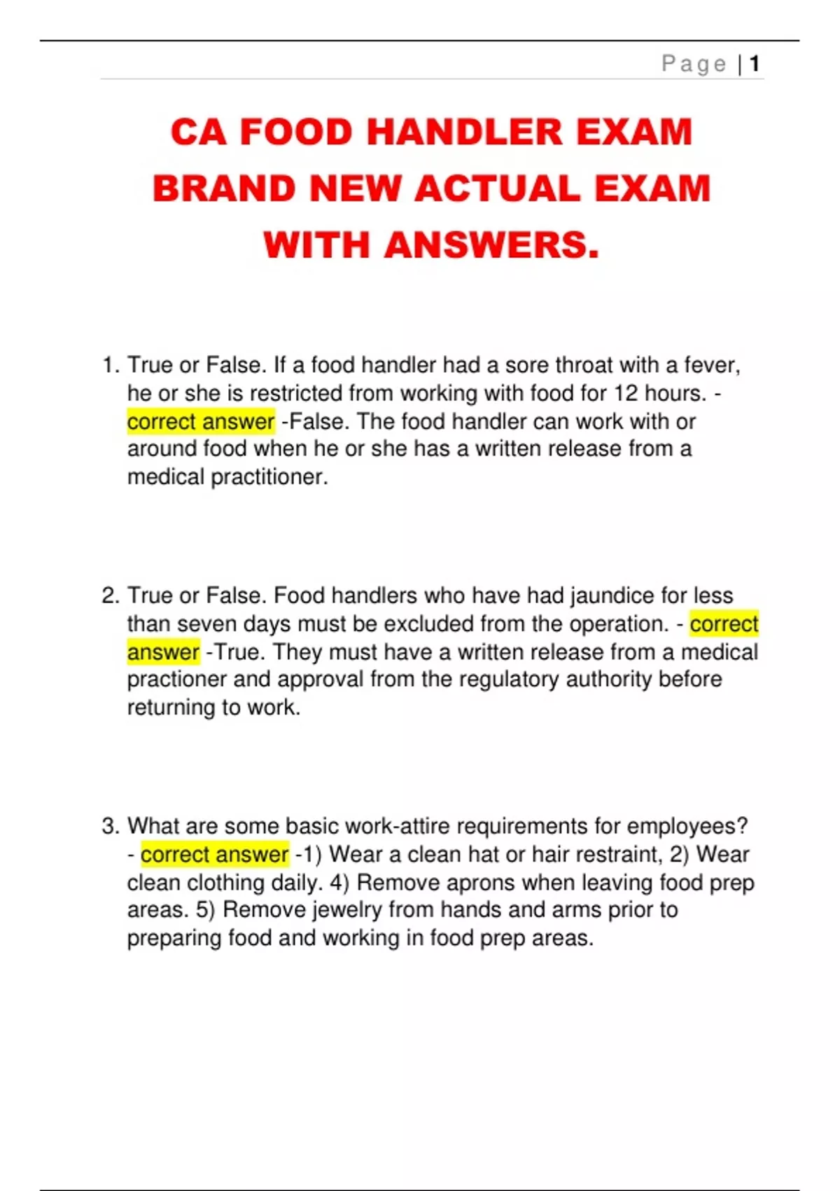 CA FOOD HANDLER EXAM BRAND NEW ACTUAL EXAM WITH ANSWERS.