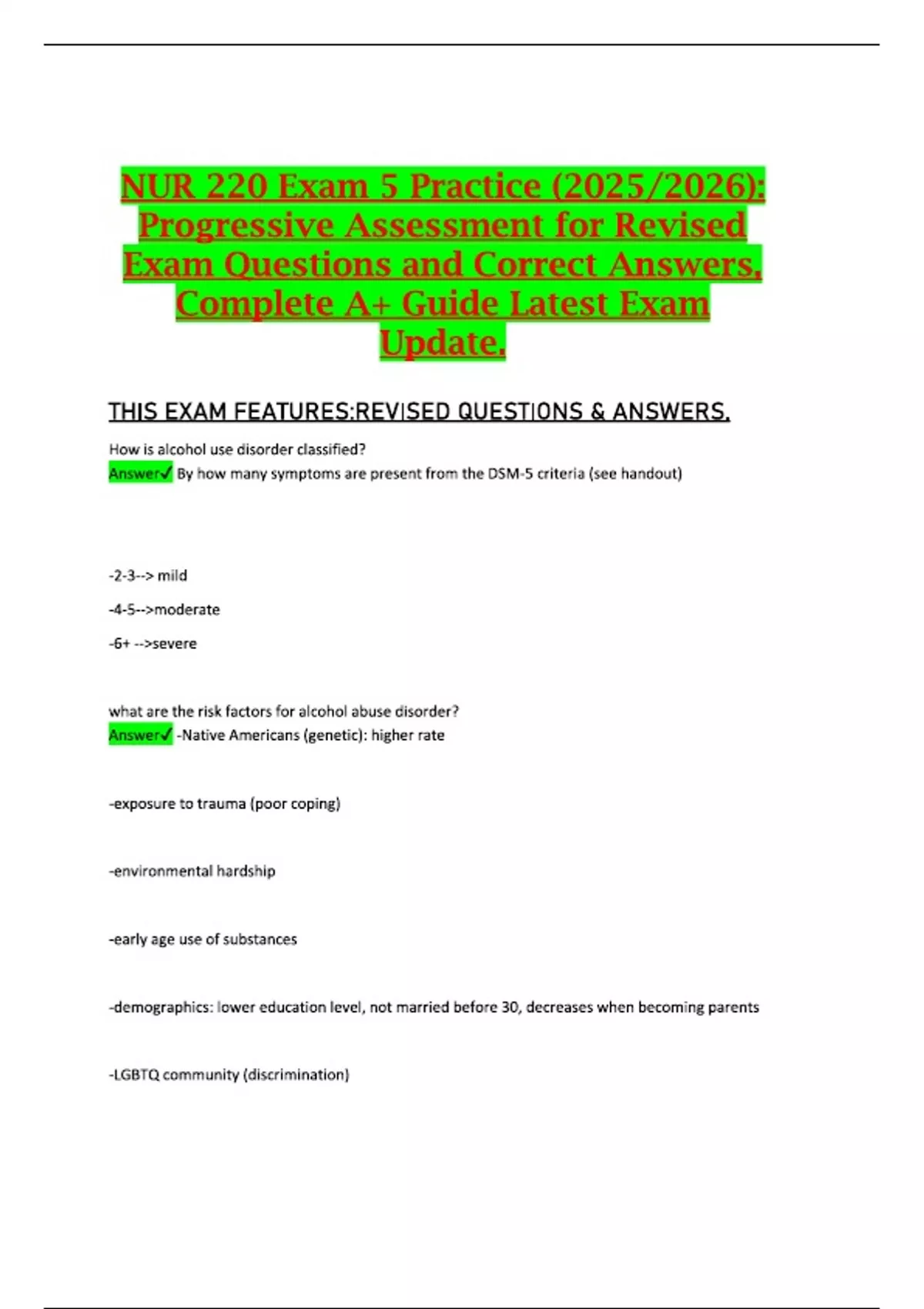 NUR 220 Exam 5 Practice (2025/2026): Progressive Assessment for Revised Exam Questions and Correct Answers, Complete A+ Guide Latest Exam Update.