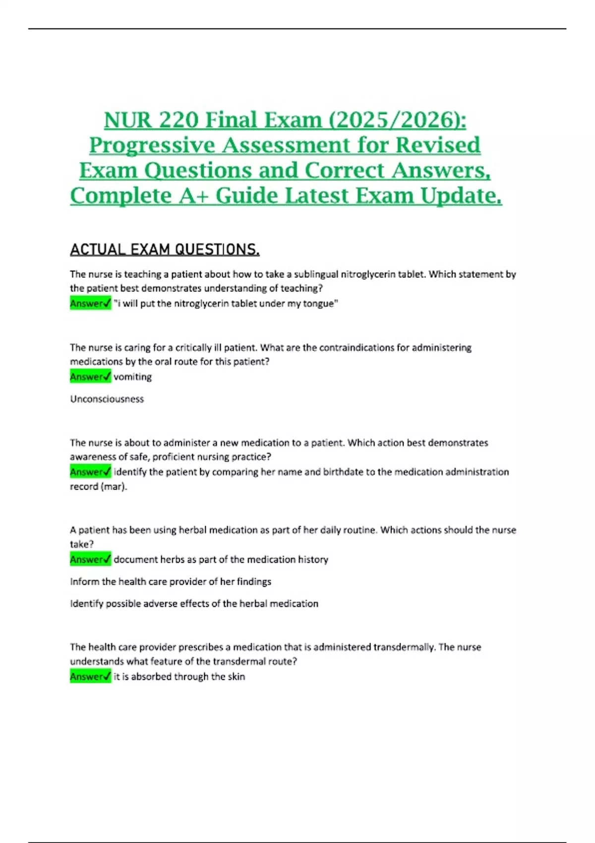 NUR 220 Final Exam (2025/2026): Progressive Assessment for Revised Exam Questions and Correct Answers, Complete A+ Guide Latest Exam Update.