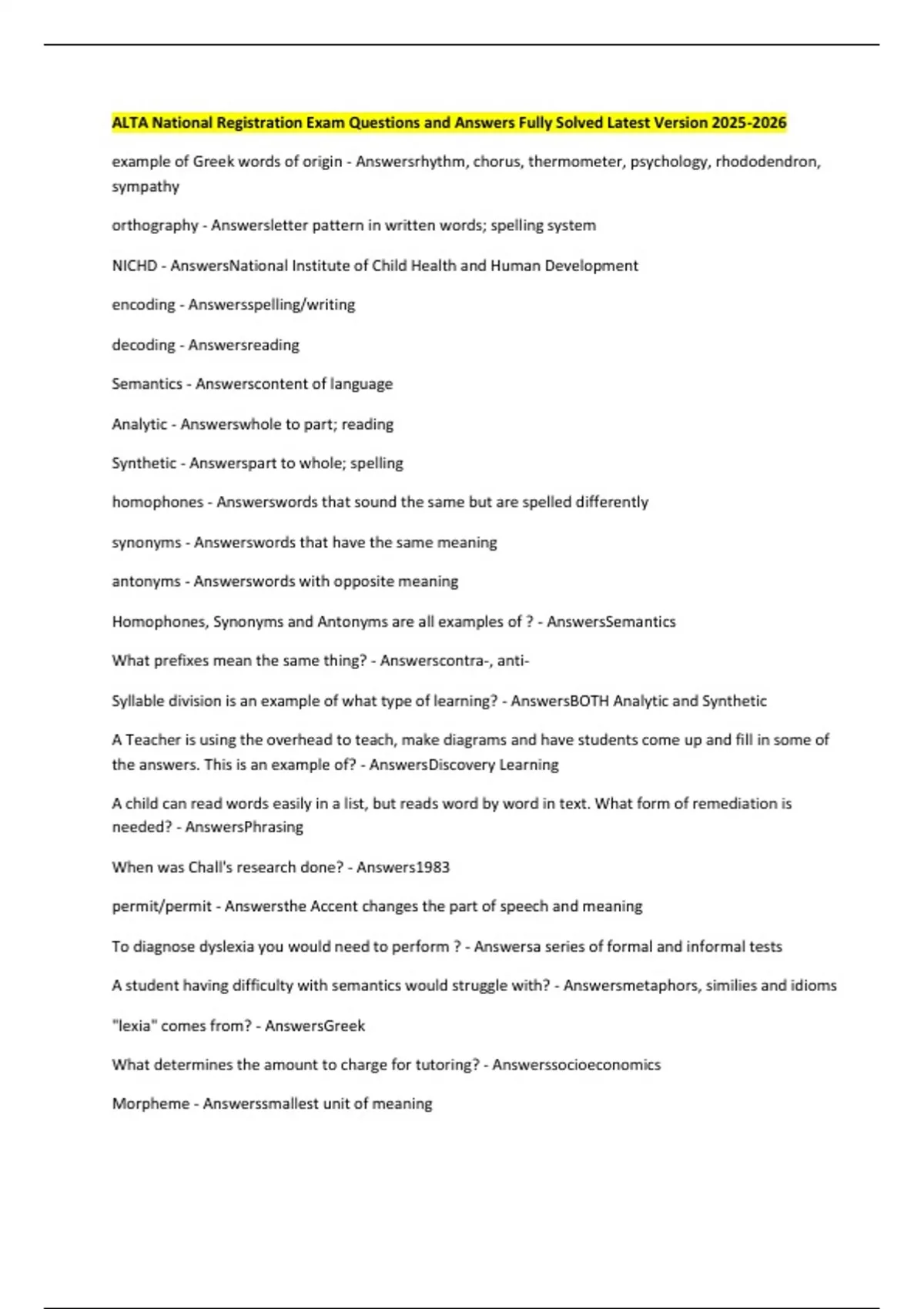 ALTA National Registration Exam Questions and Answers Fully Solved Latest Version example of Greek words of origin - Answersrhythm, chorus, thermometer, psychology, rhododendron, sympathy orthography - Answersletter pattern in written words; spelling system NICHD - AnswersNational Institute of Child Health and Human Development encoding - Answersspelling/writing decoding - Answersreading Semantics - Answerscontent of language Analytic - Answerswhole to part; reading Synthetic - Answerspart to whole; spelling homophones - Answerswords that sound the same but are spelled differently synonyms - Answerswords that have the same meaning antonyms - Answerswords with opposite meaning Homophones, Synonyms and Antonyms are all examples of ? - AnswersSemantics What prefixes mean the same thing? - Answerscontra-, anti- Syllable division is an example of what type of learning? - AnswersBOTH Analytic and Synthetic A Teacher is using the overhead to teach, make diagrams and have students come up and fill in some of the answers. This is an example of? - AnswersDiscovery Learning A child can read words easily in a list, but reads word by word in text. What form of remediation is needed? - AnswersPhrasing When was Chall's research done? - Answers1983 permit/permit - Answersthe Accent changes the part of speech and meaning To diagnose dyslexia you would need to perform ? - Answersa series of formal and informal tests A student having difficulty with semantics would struggle with? - Answersmetaphors, similies and idioms "lexia" comes from? - AnswersGreek What determines the amount to charge for tutoring? - Answerssocioeconomics Morpheme - Answerssmallest unit of meaning Phoneme - Answerssmallest unit of sound in a syllable What word is NOT r-controlled? - Answersberry What word doesn't have a use for the silent e? - Answersawe Science and Mathematic words come from? - AnswersGreek 504 is an extension of? - AnswersThe Rehabilitation Act of 1973 What does ASAP stand for? - AnswersAccent, number of Syllables, Adjacent letters, Position in the word dyslexia is a disorder that is________-based - Answerslanguage Developmental Dyslexia is? - Answersa glitch in the brain during fetal development that one is born with IDEA and 504 both mandate a ________ & _________ _________ Education - AnswersF.A.P.E. (Free and Appropriate Public Education) Pragmatics is ? - Answersthe practical application of language; conversation Soft C rule - Answersc sounds like s before e, i and y Most recent pioneer in Phonemic Awareness? Wrote "Spelling: Development, Disability, and Instruction" - AnswersLouisa C. Moats The accent usually falls on what syllable in the English language? - Answersfirst What type of memory does Rapid Naming require? - Answerslong-term memory What type of memory does Phonological Memory require? - Answersshort-term memory Auditory Discovery - Answerswhen the teacher leads students to new information, having them echo words to listen for the same new sound How should a teacher transition from one activity to another? - Answerssignal Active Learning - Answersstudents learn by connecting prior knowledge Chall's Stage 0 - AnswersPre-Reading (0-6 yrs) Chall's Stage 1 - AnswersDecoding (6-7 yrs)