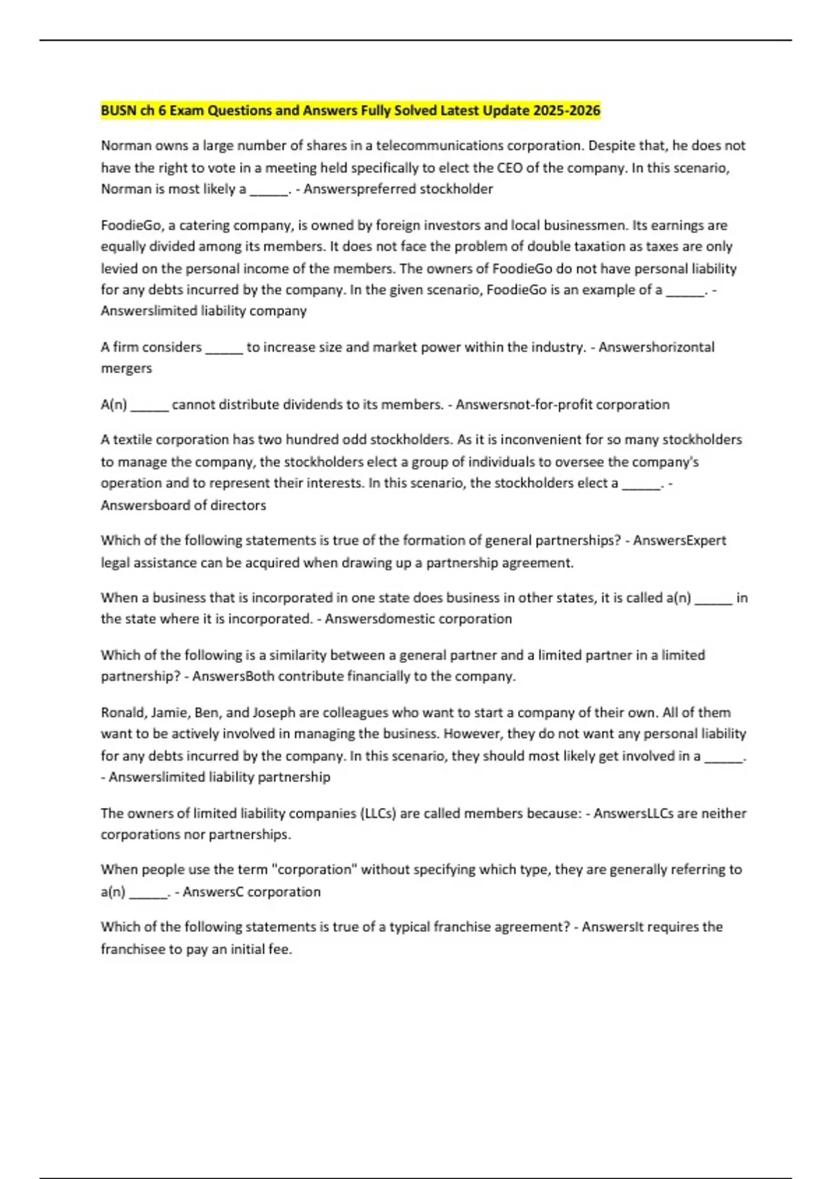 BUSN ch 6 Exam Questions and Answers Fully Solved Latest Update Norman owns a large number of shares in a telecommunications corporation. Despite that, he does not have the right to vote in a meeting held specifically to elect the CEO of the company. In this scenario, Norman is most likely a _____. - Answerspreferred stockholder FoodieGo, a catering company, is owned by foreign investors and local businessmen. Its earnings are equally divided among its members. It does not face the problem of double taxation as taxes are only levied on the personal income of the members. The owners of FoodieGo do not have personal liability for any debts incurred by the company. In the given scenario, FoodieGo is an example of a _____. - Answerslimited liability company A firm considers _____ to increase size and market power within the industry. - Answershorizontal mergers A(n) _____ cannot distribute dividends to its members. - Answersnot-for-profit corporation A textile corporation has two hundred odd stockholders. As it is inconvenient for so many stockholders to manage the company, the stockholders elect a group of individuals to oversee the company's operation and to represent their interests. In this scenario, the stockholders elect a _____. - Answersboard of directors Which of the following statements is true of the formation of general partnerships? - AnswersExpert legal assistance can be acquired when drawing up a partnership agreement. When a business that is incorporated in one state does business in other states, it is called a(n) _____ in the state where it is incorporated. - Answersdomestic corporation Which of the following is a similarity between a general partner and a limited partner in a limited partnership? - AnswersBoth contribute financially to the company. Ronald, Jamie, Ben, and Joseph are colleagues who want to start a company of their own. All of them want to be actively involved in managing the business. However, they do not want any personal liability for any debts incurred by the company. In this scenario, they should most likely get involved in a _____. - Answerslimited liability partnership The owners of limited liability companies (LLCs) are called members because: - AnswersLLCs are neither corporations nor partnerships. When people use the term "corporation" without specifying which type, they are generally referring to a(n) _____. - AnswersC corporation Which of the following statements is true of a typical franchise agreement? - AnswersIt requires the franchisee to pay an initial fee. A(n) _____ is a voluntary agreement under which two or more people act as co-owners of a