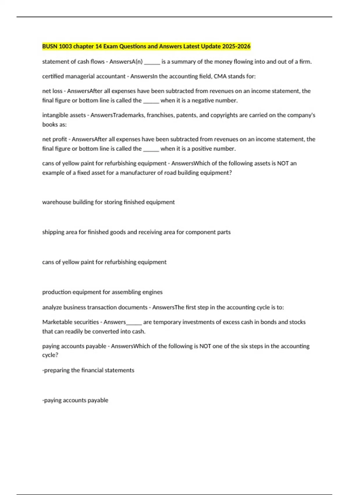 BUSN 1003 chapter 14 Exam Questions and Answers Latest Update statement of cash flows - AnswersA(n) _____ is a summary of the money flowing into and out of a firm. certified managerial accountant - AnswersIn the accounting field, CMA stands for: net loss - AnswersAfter all expenses have been subtracted from revenues on an income statement, the final figure or bottom line is called the _____ when it is a negative number. intangible assets - AnswersTrademarks, franchises, patents, and copyrights are carried on the company's books as: net profit - AnswersAfter all expenses have been subtracted from revenues on an income statement, the final figure or bottom line is called the _____ when it is a positive number. cans of yellow paint for refurbishing equipment - AnswersWhich of the following assets is NOT an example of a fixed asset for a manufacturer of road building equipment? warehouse building for storing finished equipment shipping area for finished goods and receiving area for component parts cans of yellow paint for refurbishing equipment production equipment for assembling engines analyze business transaction documents - AnswersThe first step in the accounting cycle is to: Marketable securities - Answers_____ are temporary investments of excess cash in bonds and stocks that can readily be converted into cash. paying accounts payable - AnswersWhich of the following is NOT one of the six steps in the accounting cycle? -preparing the financial statements -paying accounts payable -analyzing business transaction documents -recording business transactions in journal Current liabilities - Answers_____ are debts that are to be paid within twelve months. accounts receivable - AnswersAmounts owed to the firm by customers who bought goods and services on credit are called: assets - AnswersThings of value owned by a firm are called its: account payable - AnswersIn 2006, the retail industry voted the Bike Gallery as one of the top 100 bicycle retailers in the United States. It recently purchased a truckload of Thule brand bike racks from the manufacturer. Until the Bike Gallery pays the bill, the purchase will be carried on