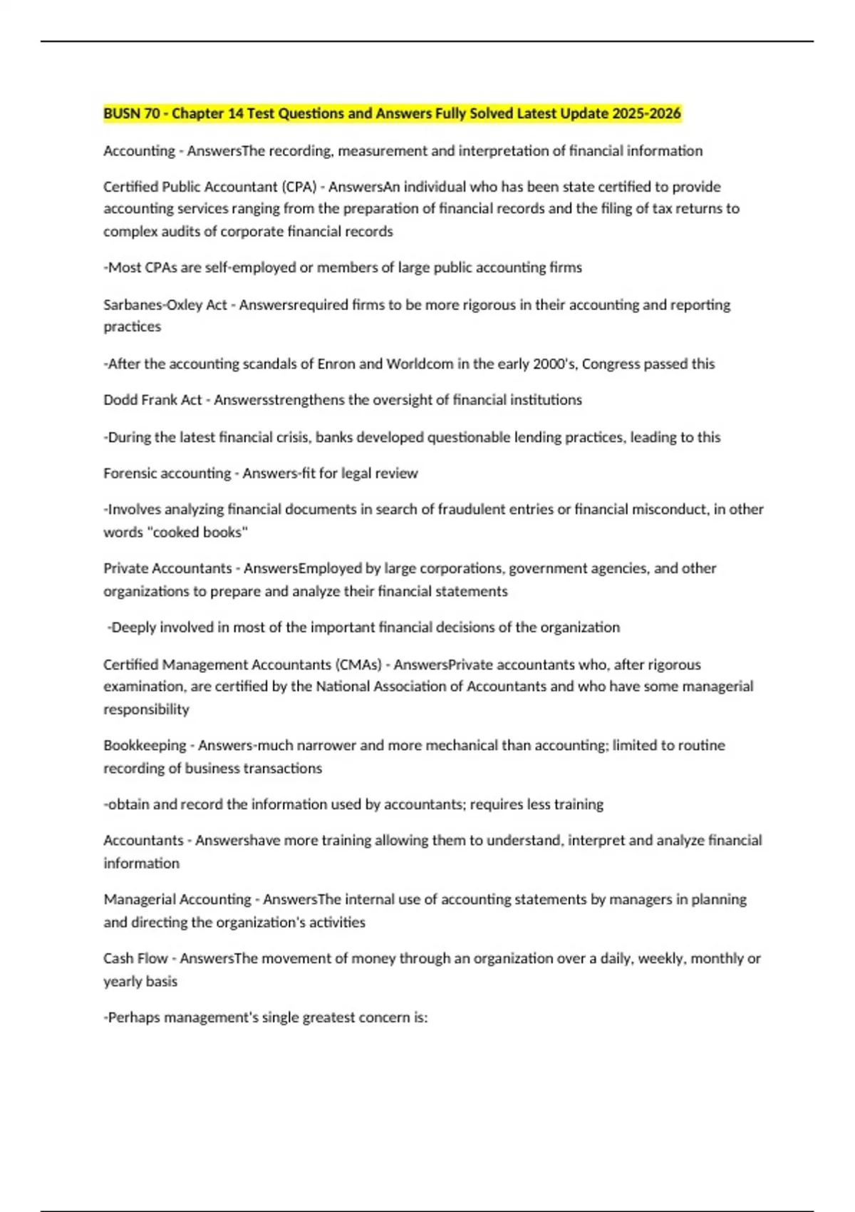 BUSN 70 - Chapter 14 Test Questions and Answers Fully Solved Latest Update Accounting - AnswersThe recording, measurement and interpretation of financial information Certified Public Accountant (CPA) - AnswersAn individual who has been state certified to provide accounting services ranging from the preparation of financial records and the filing of tax returns to complex audits of corporate financial records -Most CPAs are self-employed or members of large public accounting firms Sarbanes-Oxley Act - Answersrequired firms to be more rigorous in their accounting and reporting practices -After the accounting scandals of Enron and Worldcom in the early 2000's, Congress passed this Dodd Frank Act - Answersstrengthens the oversight of financial institutions -During the latest financial crisis, banks developed questionable lending practices, leading to this Forensic accounting - Answers-fit for legal review -Involves analyzing financial documents in search of fraudulent entries or financial misconduct, in other words "cooked books" Private Accountants - AnswersEmployed by large corporations, government agencies, and other organizations to prepare and analyze their financial statements -Deeply involved in most of the important financial decisions of the organization Certified Management Accountants (CMAs) - AnswersPrivate accountants who, after rigorous examination, are certified by the National Association of Accountants and who have some managerial responsibility Bookkeeping - Answers-much narrower and more mechanical than accounting; limited to routine recording of business transactions -obtain and record the information used by accountants; requires less training Accountants - Answershave more training allowing them to understand, interpret and analyze financial information Managerial Accounting - AnswersThe internal use of accounting statements by managers in planning and directing the organization's activities Cash Flow - AnswersThe movement of money through an organization over a daily, weekly, monthly or yearly basis -Perhaps management's single greatest concern is: Budget - AnswersAn internal financial plan that forecasts expenses and income over a set period of time -Managerial accountants help prepare this -The principal value of budgets lies in the breakdown of cash inflows and outflows accounting statements - Answers-Managers use accounting statements to report to outsiders -Used for filing income taxes, obtaining credit and reporting results to stockholders Audited financial statements - Answersare those signed off on by a certified public accountant The Accounting Equation - AnswersAssets = Liabilities + Owner's Equity Assets - AnswersA firm's economic resources, or items of value that it owns, such as cash, inventory, land, equipment, buildings, and other tangible and intangible things Short term assets - Answersanything that can be turned into cash after a year, always at the top of financial statement, wall street pays attention to this Long term assets - Answersasset that will take longer than a year to liquidate it into cash, like land Liabilities - AnswersDebts that a firm owes to others Not all debt is bad to a company -Interest you pay on a debt is a write off Owners' Equity - AnswersEquals assets minus liabilities and reflects historical values Double-Entry Bookkeeping - AnswersA system of recording and classifying business transactions that maintains the balance of the accounting equation