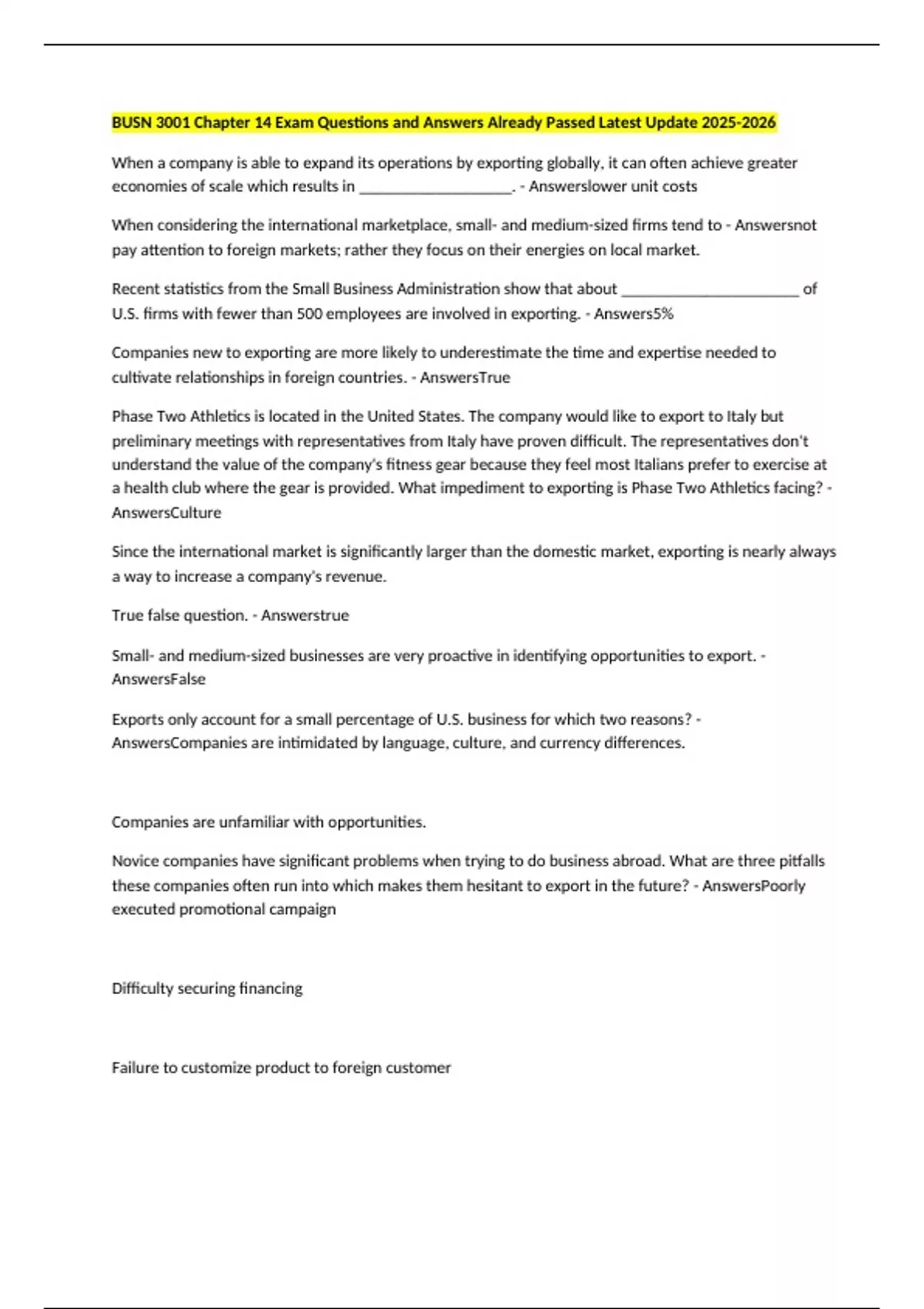 BUSN 3001 Chapter 14 Exam Questions and Answers Already Passed Latest Update When a company is able to expand its operations by exporting globally, it can often achieve greater economies of scale which results in __________________. - Answerslower unit costs When considering the international marketplace, small- and medium-sized firms tend to - Answersnot pay attention to foreign markets; rather they focus on their energies on local market. Recent statistics from the Small Business Administration show that about _____________________ of U.S. firms with fewer than 500 employees are involved in exporting. - Answers5% Companies new to exporting are more likely to underestimate the time and expertise needed to cultivate relationships in foreign countries. - AnswersTrue Phase Two Athletics is located in the United States. The company would like to export to Italy but preliminary meetings with representatives from Italy have proven difficult. The representatives don't understand the value of the company's fitness gear because they feel most Italians prefer to exercise at a health club where the gear is provided. What impediment to exporting is Phase Two Athletics facing? - AnswersCulture Since the international market is significantly larger than the domestic market, exporting is nearly always a way to increase a company's revenue. True false question. - Answerstrue Small- and medium-sized businesses are very proactive in identifying opportunities to export. - AnswersFalse Exports only account for a small percentage of U.S. business for which two reasons? - AnswersCompanies are intimidated by language, culture, and currency differences. Companies are unfamiliar with opportunities. Novice companies have significant problems when trying to do business abroad. What are three pitfalls these companies often run into which makes them hesitant to export in the future? - AnswersPoorly executed promotional campaign Difficulty securing financing Failure to customize product to foreign customer What three impediments would make it difficult for some companies to gain knowledge of opportunities available in foreign countries? - AnswersDistance Time Language _________________________ are the Japanese trading houses that work with their affiliated companies to identify export opportunities. - AnswersSogo shosha German and Japanese firms are viewed as having a ____________________ advantage in exporting compared to U.S. firms. - Answersbigger Companies new to exporting are more likely to underestimate the time and expertise needed to cultivate relationships in foreign countries. - Answerstrue Kevin works at a company in Ohio and is in charge of researching available export opportunities. Which two organizations should he initially contact to learn more? - AnswersU.S. and Foreign and Commercial Service International Trade Administration The companies unique to Japan that trade in a wide range of products and materials and act as intermediaries to identify export opportunities are called - Answerssogo shosha