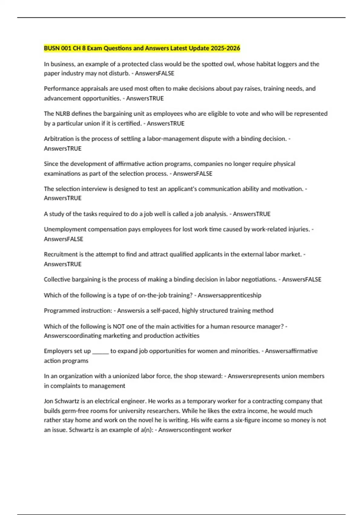 BUSN 001 CH 8 Exam Questions and Answers Latest Update In business, an example of a protected class would be the spotted owl, whose habitat loggers and the paper industry may not disturb. - AnswersFALSE Performance appraisals are used most often to make decisions about pay raises, training needs, and advancement opportunities. - AnswersTRUE The NLRB defines the bargaining unit as employees who are eligible to vote and who will be represented by a particular union if it is certified. - AnswersTRUE Arbitration is the process of settling a labor-management dispute with a binding decision. - AnswersTRUE Since the development of affirmative action programs, companies no longer require physical examinations as part of the selection process. - AnswersFALSE The selection interview is designed to test an applicant's communication ability and motivation. - AnswersTRUE A study of the tasks required to do a job well is called a job analysis. - AnswersTRUE Unemployment compensation pays employees for lost work time caused by work-related injuries. - AnswersFALSE Recruitment is the attempt to find and attract qualified applicants in the external labor market. - AnswersTRUE Collective bargaining is the process of making a binding decision in rlabor negotiations. - AnswersFALSE Which of the following is a type of on-the-job training? - Answersapprenticeship