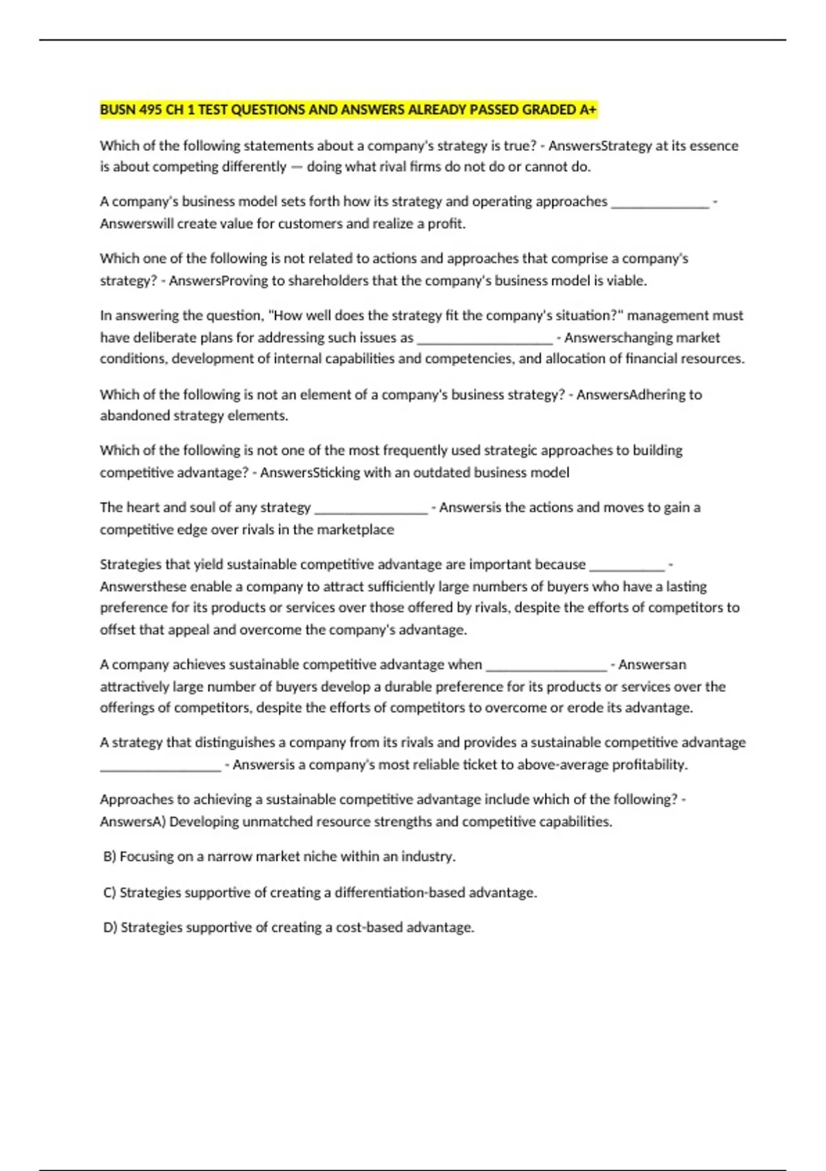 AnswersA) Developing unmatched resource strengths and competitive capabilities.