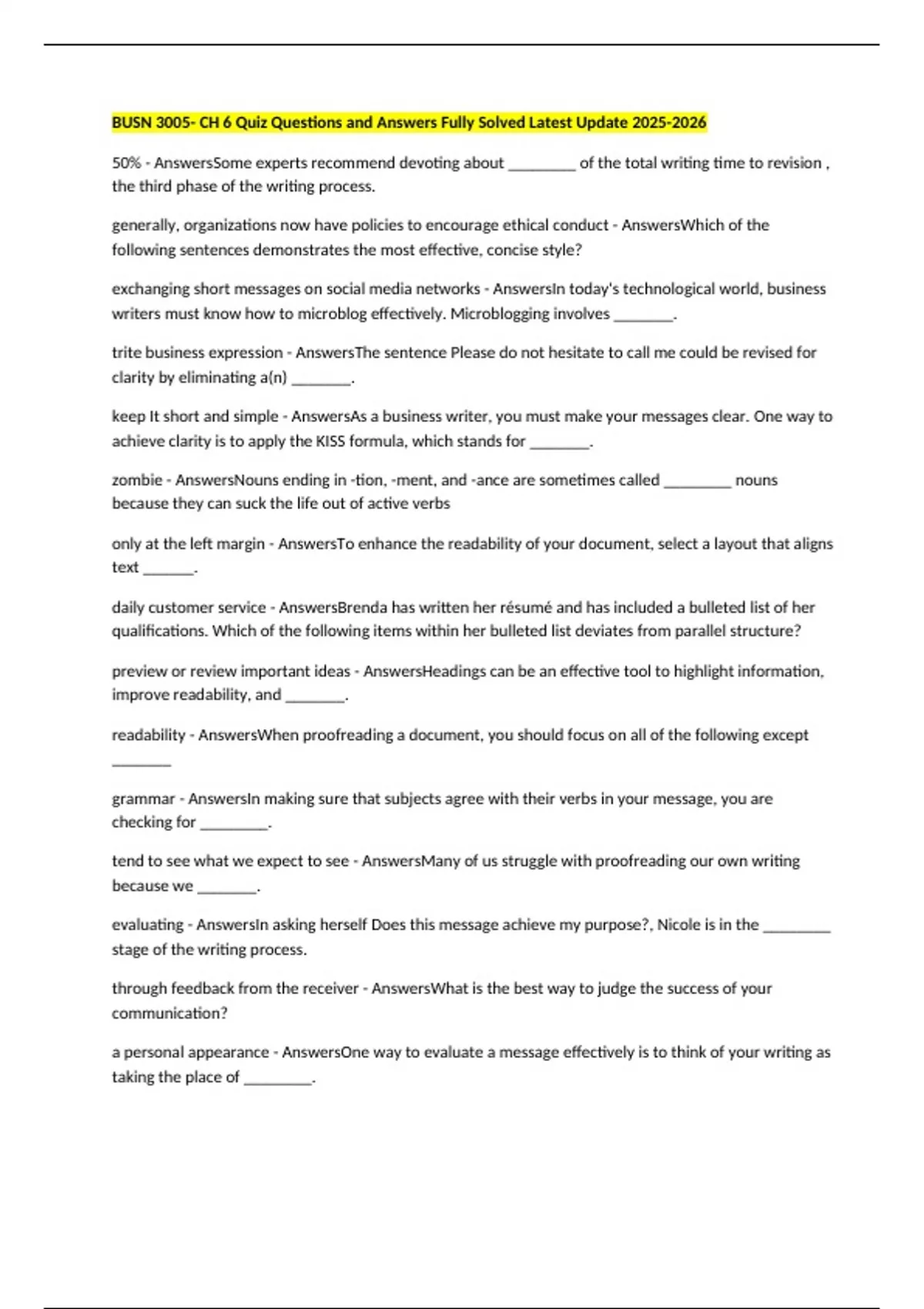 BUSN 3005- CH 6 Quiz Questions and Answers Fully Solved Latest Update 50% - AnswersSome experts recommend devoting about ________ of the total writing time to revision , the third phase of the writing process. generally, organizations now have policies to encourage ethical conduct - AnswersWhich of the following sentences demonstrates the most effective, concise style? exchanging short messages on social media networks - AnswersIn today's technological world, business writers must know how to microblog effectively. Microblogging involves _______. trite business expression - AnswersThe sentence Please do not hesitate to call me could be revised for clarity by eliminating a(n) _______. keep It short and simple - AnswersAs a business writer, you must make your messages clear. One way to achieve clarity is to apply the KISS formula, which stands for _______. zombie - AnswersNouns ending in -tion, -ment, and -ance are sometimes called ________ nouns because they can suck the life out of active verbs only at the left margin - AnswersTo enhance the readability of your document, select a layout that aligns text ______. daily customer service - AnswersBrenda has written her résumé and has included a bulleted list of her qualifications. Which of the following items within her bulleted list deviates from parallel structure? preview or review important ideas - AnswersHeadings can be an effective tool to highlight information, improve readability, and _______. readability - AnswersWhen proofreading a document, you should focus on all of the following except _______ grammar - AnswersIn making sure that subjects agree with their verbs in your message, you are checking for ________. tend to see what we expect to see - AnswersMany of us struggle with proofreading our own writing because we _______. evaluating - AnswersIn asking herself Does this message achieve my purpose?, Nicole is in the ________ stage of the writing process. through feedback from the receiver - AnswersWhat is the best way to judge the success of your communication? a personal appearance - AnswersOne way to evaluate a message effectively is to think of your writing as taking the place of ________. false; editing means improving the content and sentence structure of your message. Proofreading involves correcting its grammar, spelling, punctuation, format, and mechanics. - AnswersT/F: Editing and proofreading are interchangeable terms for correcting a message's