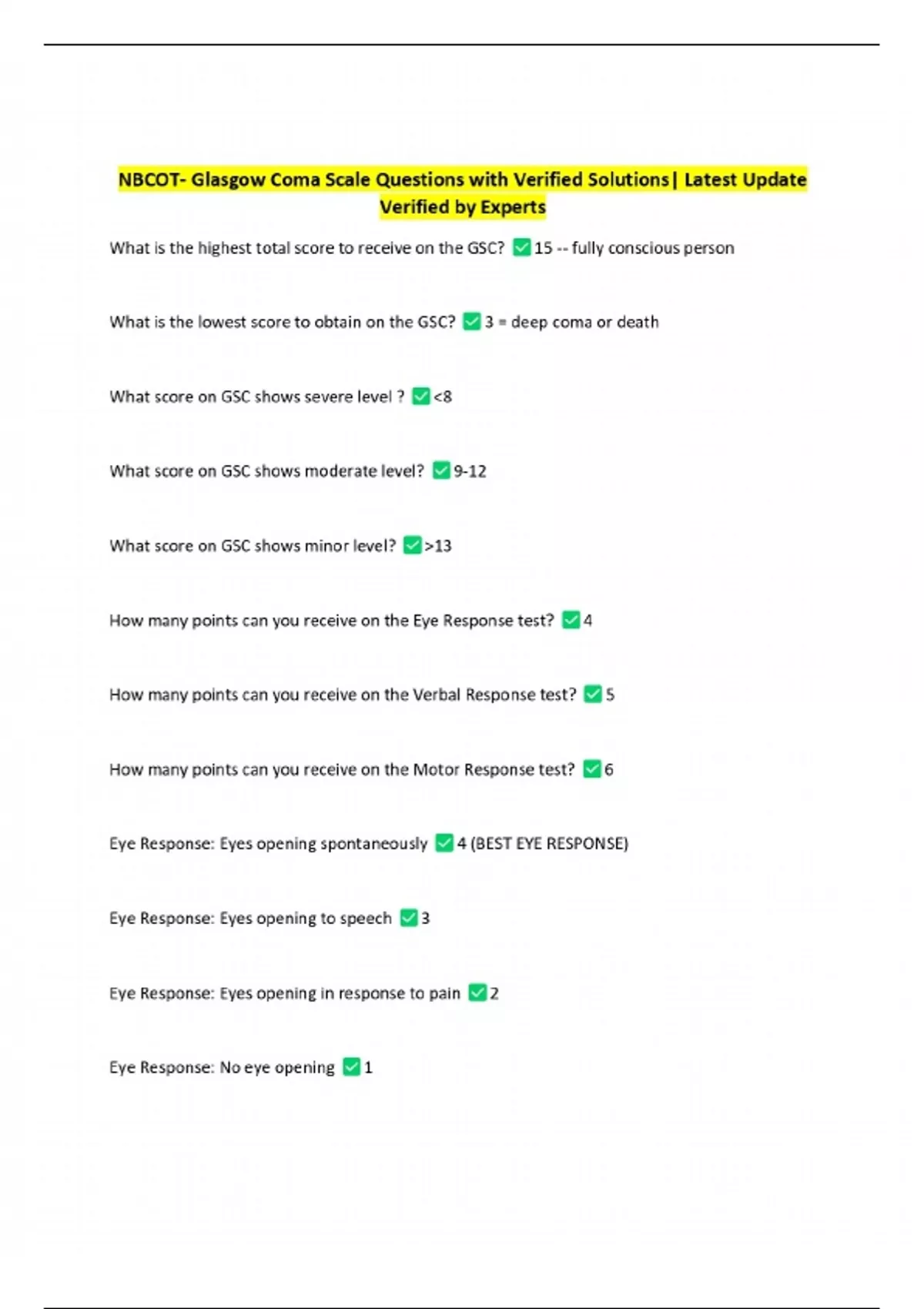 NBCOT- Glasgow Coma Scale Questions with Verified Solutions| Latest Update Verified by Experts