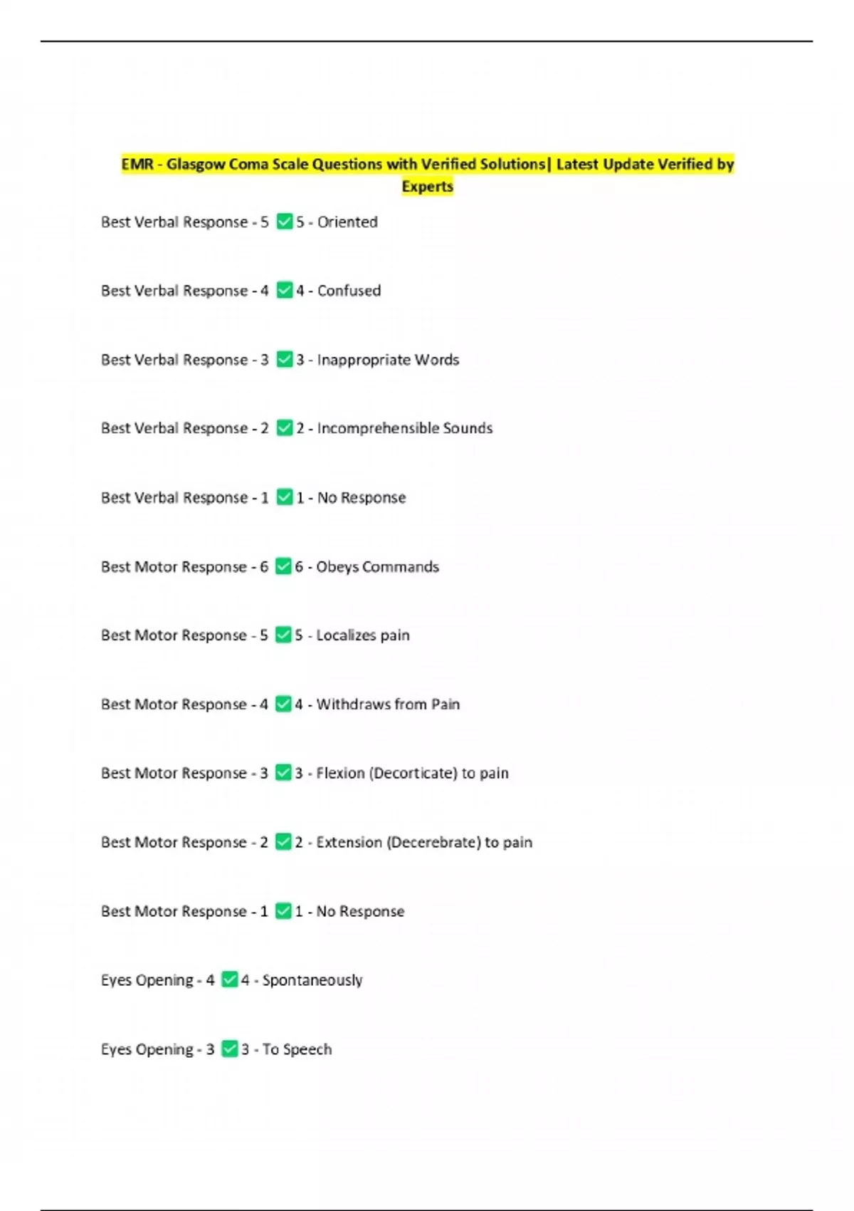 EMR - Glasgow Coma Scale Questions with Verified Solutions| Latest Update Verified by Experts
