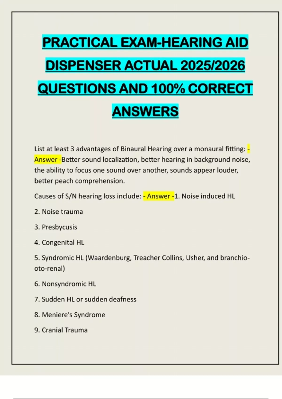 PRACTICAL EXAM-HEARING AID DISPENSER ACTUAL 2025/2026 QUESTIONS AND 100% CORRECT ANSWERS List at least 3 advantages of Binaural Hearing over a monaural fitting: - Answer -Better sound localization, better hearing in background noise, the ability to focus one sound over another, sounds appear louder, better peach comprehension. Causes of S/N hearing loss include: - Answer -1. Noise induced HL 2. Noise trauma 3. Presbycusis 4. Congenital HL 5. Syndromic HL (Waardenburg, Treacher Collins, Usher, and branchiooto-renal) 6. Nonsyndromic HL 7. Sudden HL or sudden deafness 8. Meniere's Syndrome 9. Cranial Trauma10. Ototoxic drugs A. reduced audibility and intelligibility 1. poor frequency selectivity 2. reduced dynamic range 3. SNHL elevates thresholds but tolerance for loud sounds is unchanged relative to normal B. Recruitment 1. an exaggerated perception of loud sounds (abnormal loudness growth) 2. Important to measure UCLs at multiple frequencies to accurately measure dynamic range. Effects of S/N hearing loss include: - Answer -A. reduced audibility and intelligibility 1. poor frequency selectivity 2. reduced dynamic range 3. SNHL elevates thresholds but tolerance for loud sounds is unchanged relative to normal B. Recruitment 1. an exaggerated perception of loud sounds (abnormal loudness growth)