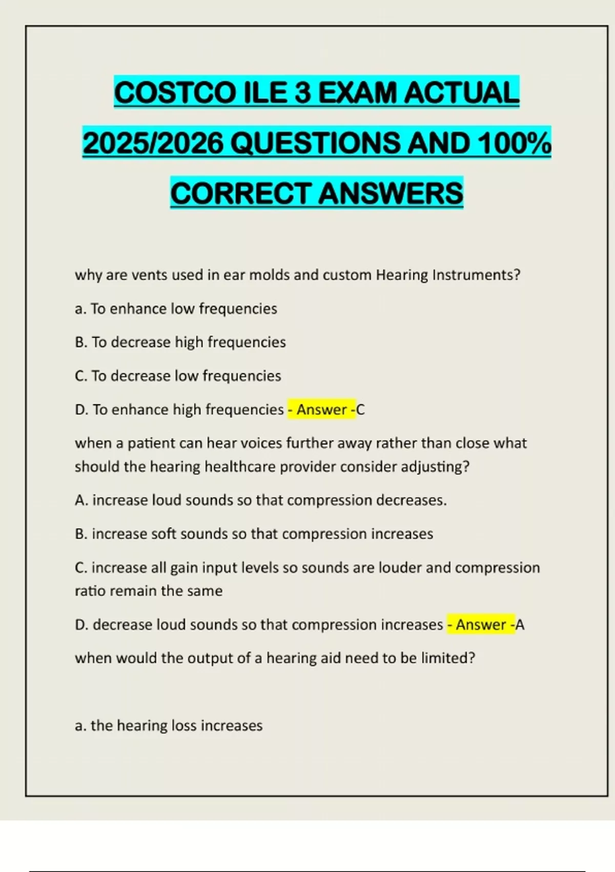 COSTCO ILE 3 EXAM ACTUAL 2025/2026 QUESTIONS AND 100% CORRECT ANSWERS why are vents used in ear molds and custom Hearing Instruments? a. To enhance low frequencies B. To decrease high frequencies C. To decrease low frequencies D. To enhance high frequencies - Answer -C when a patient can hear voices further away rather than close what should the hearing healthcare provider consider adjusting? A. increase loud sounds so that compression decreases. B. increase soft sounds so that compression increases C. increase all gain input levels so sounds are louder and compression ratio remain the same D. decrease loud sounds so that compression increases - Answer -A when would the output of a hearing aid need to be limited? a. the hearing loss increasesb. the ucl's decreased c. the dynamic range increases d. all of the above - Answer -b a patient should sit how far away from the loud speaker for REM? a. 1/2 meter B. 3 meters C. 2 meters d. 1 meter - Answer -d a patient's family would like strategies they can utilize when speaking on the phone to your patient. What should the hearing healthcare provider recommend they do? a. speak clearly and give small pauses between phrases b. Speak loudly as they may not have the phone close to their ear due to feedback c. speak loudly and make sure to repeat if he does not understand d. all of the above - Answer -