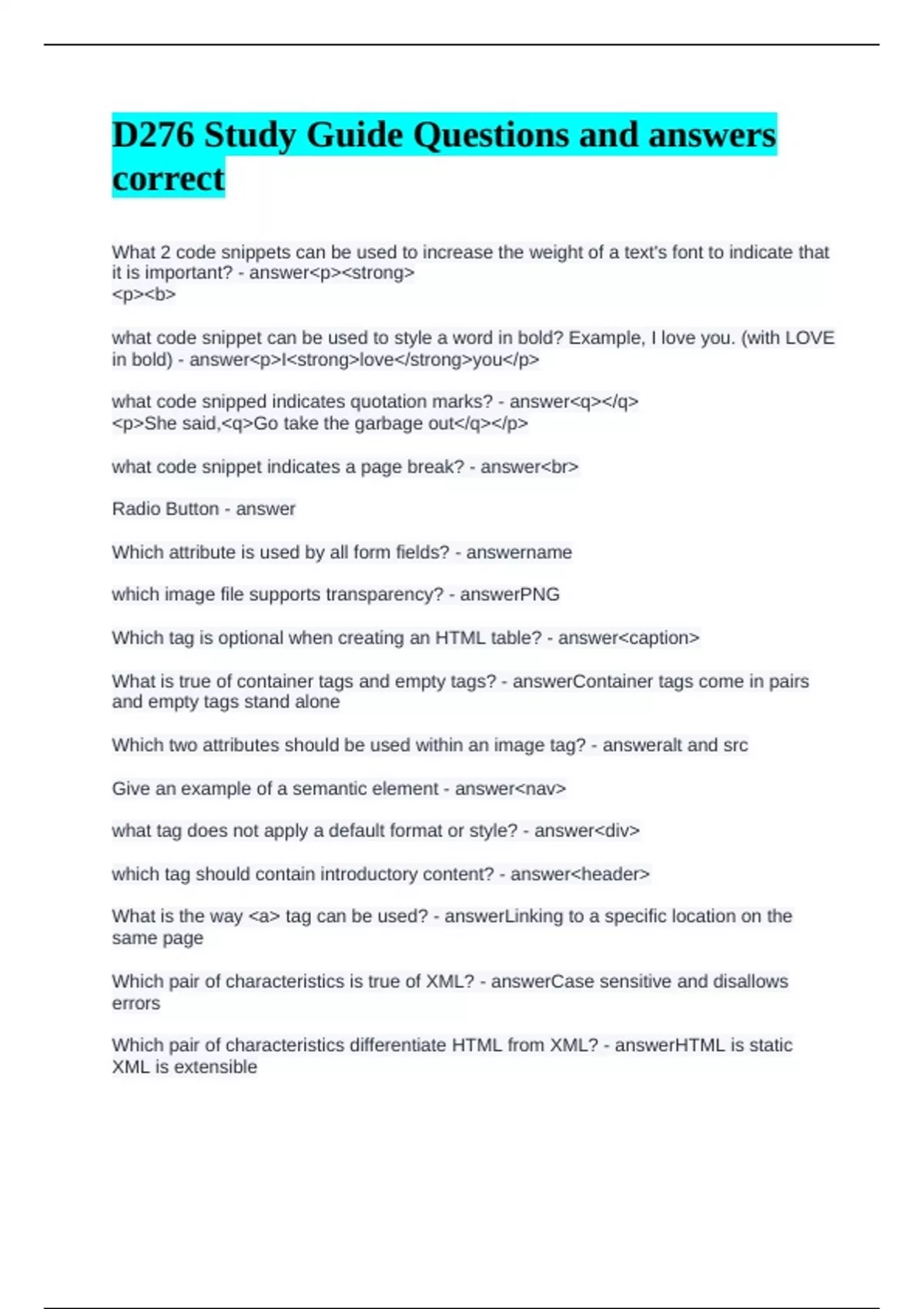 D276 Study Guide Questions and answers correct What 2 code snippets can be used to increase the weight of a text's font to indicate that it is important? pstrong pb what code snippet can be used to style a word in bold? Example, I love you. (with LOVE in bold) pIstronglove/strongyou/p what code snipped indicates quotation marks? q/q pShe said,qGo take the garbage out/q/p what code snippet indicates a page break? br Radio Button Which attribute is used by all form fields? name which image file supports transparency? PNG Which tag is optional when creating an HTML table? caption What is true of container tags and empty tags? Container tags come in pairs and empty tags stand alone Which two attributes should be used within an image tag? alt and src Give an example of a semantic element nav what tag does not apply a default format or style? div which tag should contain introductory content? header What is the way a tag can be used? Linking to a specific location on the same page Which pair of characteristics is true of XML? Case sensitive and disallows errors Which pair of characteristics differentiate HTML from XML? HTML is static XML is extensible XML (Extensible Markup Language) Is used by businesses to interchange web site data with many different types of applications External CSS Allows element style updates to multiple pages from a single location Internal CSS What echnique for implementing CSS in an HTML file is used for page-level style declarations? link Tag used to reference an external CSS sheet within an HTML document Which style rule selects and formats every childless paragraph element? p:empty { Which CSS selector styles the first character of a sentence differently? ::first-letter Which CSS selector represents the first-child pseudo-class selector? :first-child Name a unit of absolute size px Which CSS selector is used to style general sibling elements? ~ What should be used to optimize a website for viewing across different devices and improve a user's experience? Responsive design What are two unique characteristics that define a polygon hot spot? Begins and ends at the same pair of coordinates Contains many pairs of coordinates Site Map Helps users find content throughout a website Which pseudo-class changes the background color of the link on mouse-over? a:hover Which pseudo-class can be used to change the default color of a link after it has been clicked by the user? a:visited Which unit of measurement sets the text size of the div element to be double that of the html element? rem Which two units make the size of an element responsive to screen size? vw vh A website developer needs to create a website that looks suitable on mobile, tablet, and desktop devices. Which type of web design should the developer use? Responsive Design Which CSS properties are used to specify the amount of space between grid columns and rows? column-gap and row-gap Which CSS rule should be used to create three columns of equal width? grid-template-columns: 1fr 1fr 1fr; What is the global setting in Bootstrap that affects the overall text appearance on a website? Typography Which Bootstrap installation option avoids bundling Bootstrap with the source code of a website? CDN Which type of Bootstrap library includes several symbols that can be used within a web page? Icons Which Firefox Developer Tools tab is used to view and edit cookies on a site? Storage Which Firefox Developer Tools tab displays how long a request took for each site resource type? Network What can be used to instantly apply changes to applied styles? Browser developer tools A website developer identifies an issue with a CSS property value taking precedence over an element. Which Firefox Developer Tools tab should the developer access to review CSS declaration precedence? Inspector Which Chrome DevTools tab is accessed to view logged JavaScript messages and run JavaScript? Console Use the given HTML document to answer the following question: !DOCTYPE html html body h1headerThis is the introduction statement/h1 /header pThis is the story I am telling/p /body /html Which error is present in this code? The header tag should be to the left of the h1 tag. li ... /li Defines a list item ol ... /ol Stands for ordered list. Creates a numbered list when used with the Li.../Li tags. list-style-type A CSS property that provides the ability to change the bullet used in an unordered list and offers more numbering options in an ordered list. Nested List A list that is an element of another list. A list within a list table ... /table An HTML structure that allows data to be organized in rows and columns. cell a location within an HTML table structure at a specific row and column tr ... /tr An HTML table row element; contains all the cells in a row th.../th An HTML table header; creates a cell whose content is centered and bold. Typically used for column and row headings td.../td Creates a table cell caption... /caption An HTML table element that displays its content above and centered its associated table. colspan attribute to make a cell span many columns rowspan attribute to make a cell span many rows thead.../thead An optional table header element that defines the table header tbody.../tbody An optional table body element that defines the table body tfoot..../tfoot An optional table footer that defines the table footer img an HTML element that displays an image in webpage src A mandatory attribute for many HTML elements that specifies the URL of an image or other resource to display in a webpage. alt A optional attribute to be used with the img element to support an alternative to displaying the image. It is a best practice to include this attribute. Aspect Ratio The ratio of an image width to the image height. It is written as width:height. JPEG (Joint Photographic Experts Group) Joint Photographic Experts Group - an image format commonly used for digital photographs. PNG (Portable Network Graphics) Portable Network Graphics - an image fo