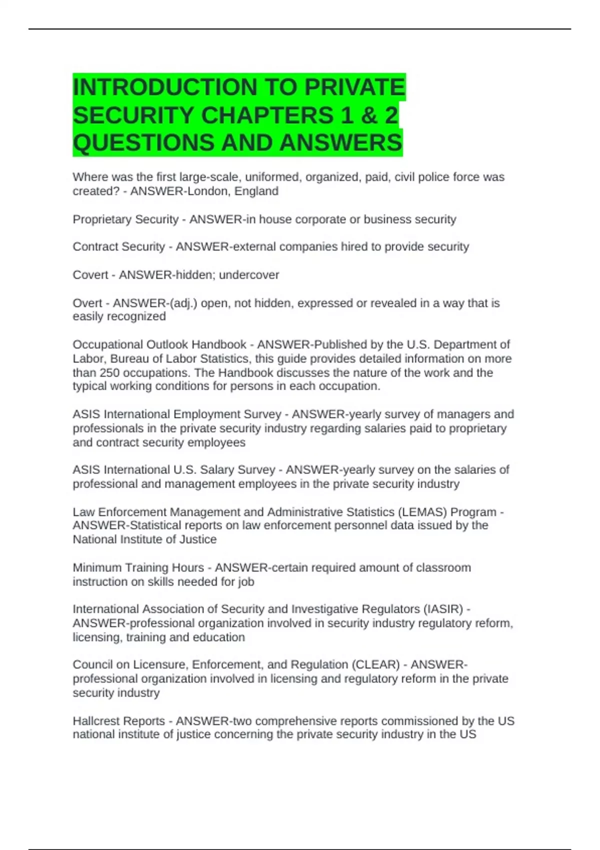 INTRODUCTION TO PRIVATE SECURITY CHAPTERS 1 & 2 QUESTIONS AND ANSWERS