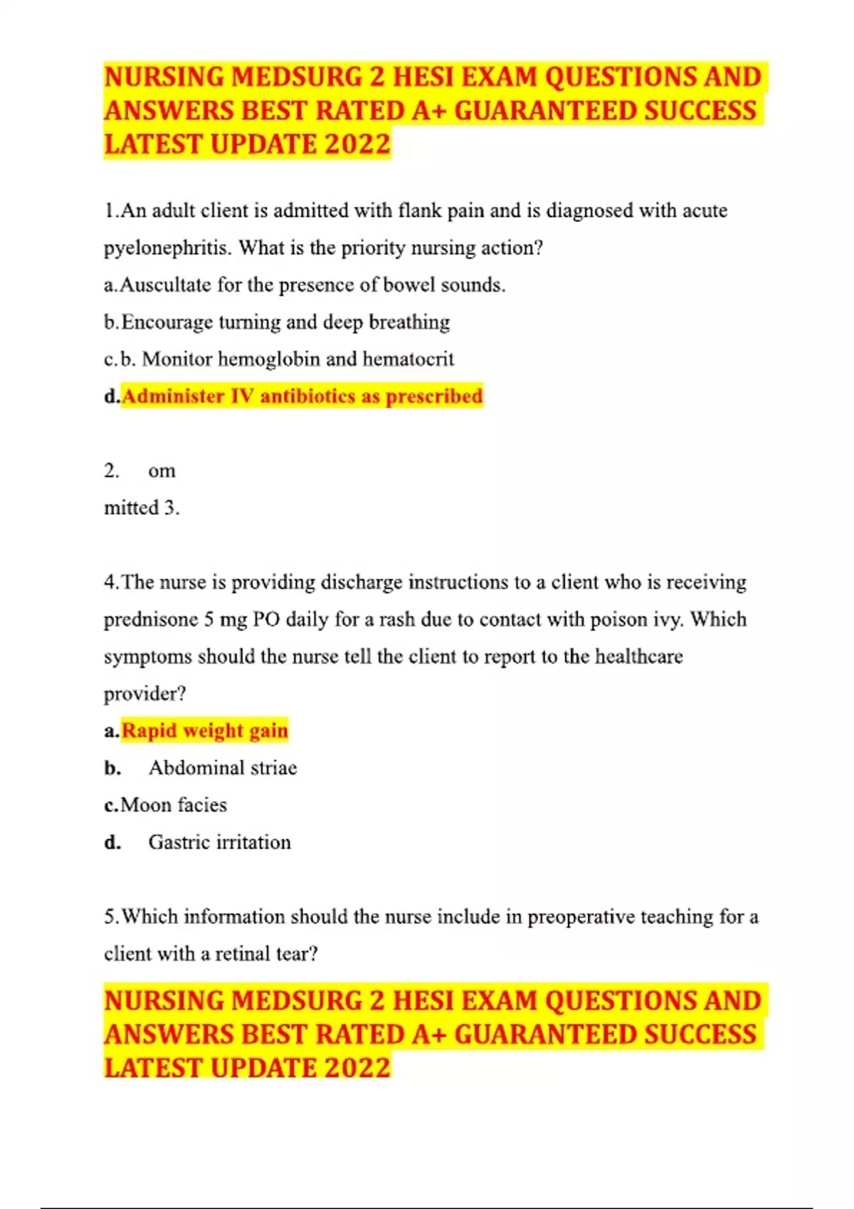 NURSING MEDSURG 2 HESI EXAM QUESTIONS AND ANSWERS BEST RATED A+ GUARANTEED SUCCESSFUL