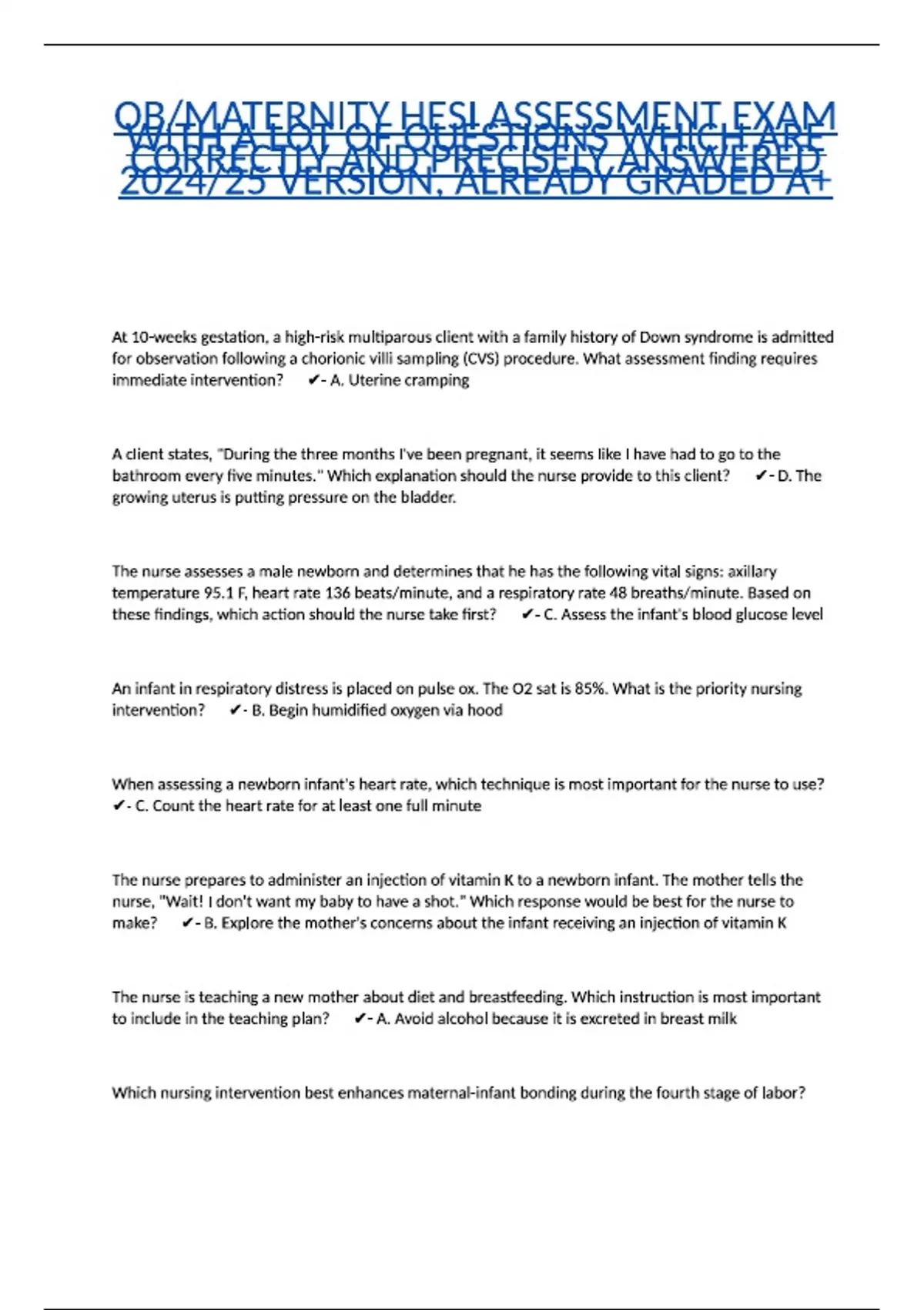OB - MATERNITY HESI ASSESSMENT EXAM WITH A LOT OF QUESTIONS WHICH ARE CORRECTLY ANSWERED