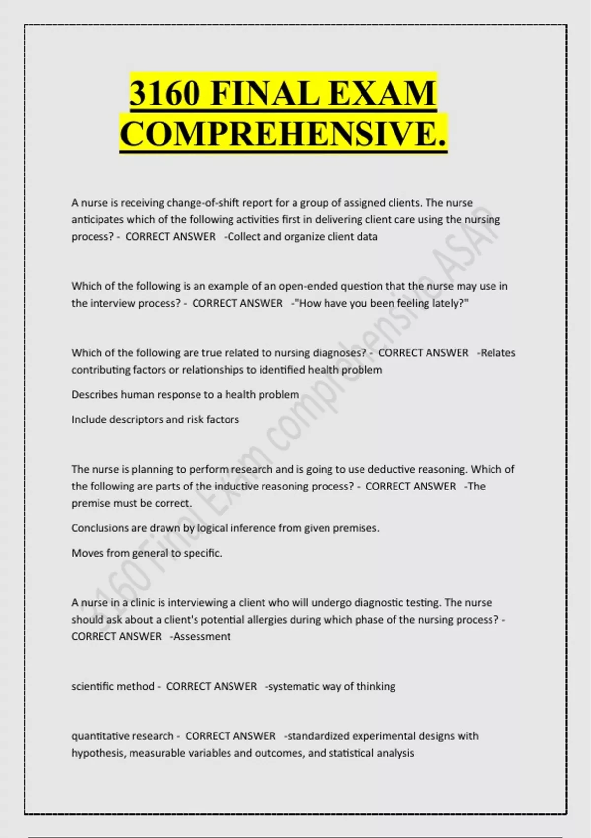 3160 FINAL EXAM COMPREHENSIVE. A nurse is receiving change-of-shift report for a group of assigned clients. The nurse anticipates which of the following activities first in delivering client care using the nursing process? - CORRECT ANSWER -Collect and organize client data Which of the following is an example of an open-ended question that the nurse may use in the interview process? - CORRECT ANSWER -"How have you been feeling lately?" Which of the following are true related to nursing diagnoses? - CORRECT ANSWER -Relates contributing factors or relationships to identified health problem Describes human response to a health problem Include descriptors and risk factors The nurse is planning to perform research and is going to use deductive reasoning. Which of the following are parts of the inductive reasoning process? - CORRECT ANSWER -The premise must be correct. Conclusions are drawn by logical inference from given premises. Moves from general to specific. A nurse in a clinic is interviewing a client who will undergo diagnostic testing. The nurse should ask about a client's potential allergies during which phase of the nursing process? - CORRECT ANSWER -Assessment scientific method - CORRECT ANSWER -systematic way of thinking quantitative research - CORRECT ANSWER -standardized experimental designs with hypothesis, measurable variables and outcomes, and statistical analysis