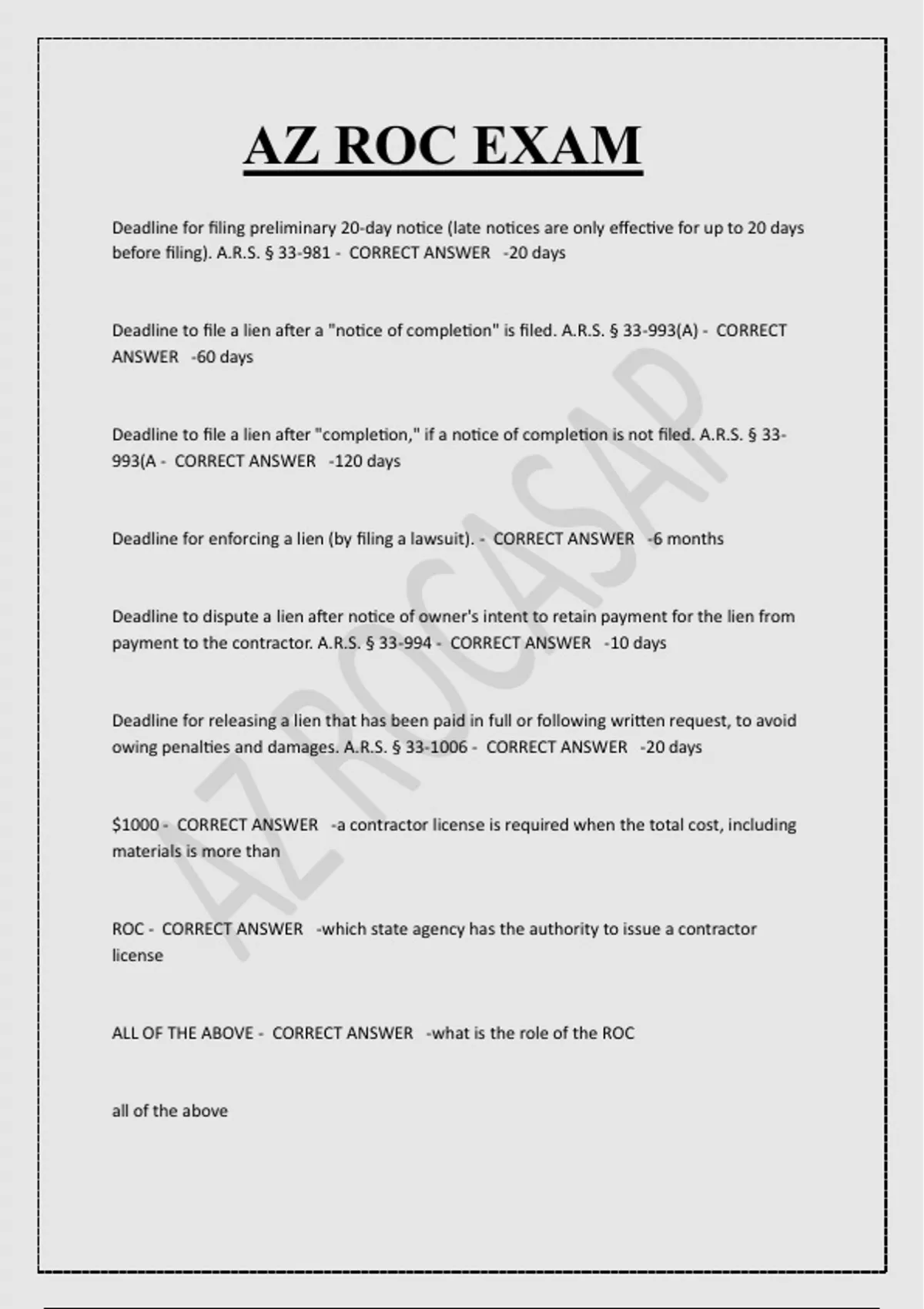 AZ ROC EXAM Deadline for filing preliminary 20-day notice (late notices are only effective for up to 20 days before filing). A.R.S. § 33-981 - CORRECT ANSWER -20 days Deadline to file a lien after a "notice of completion" is filed. A.R.S. § 33-993(A) - CORRECT ANSWER -60 days Deadline to file a lien after "completion," if a notice of completion is not filed. A.R.S. § 33 993(A - CORRECT ANSWER -120 days Deadline for enforcing a lien (by filing a lawsuit). - CORRECT ANSWER -6 months Deadline to dispute a lien after notice of owner's intent to retain payment for the lien from payment to the contractor. A.R.S. § 33-994 - CORRECT ANSWER -10 days Deadline for releasing a lien that has been paid in full or following written request, to avoid owing penalties and damages. A.R.S. § 33-1006 - CORRECT ANSWER -20 days $1000 - CORRECT ANSWER -a contractor license is required when the total cost, including materials is more than ROC - CORRECT ANSWER -which state agency has the authority to issue a contractor license ALL OF THE ABOVE - CORRECT ANSWER -what is the role of the ROC all of the above