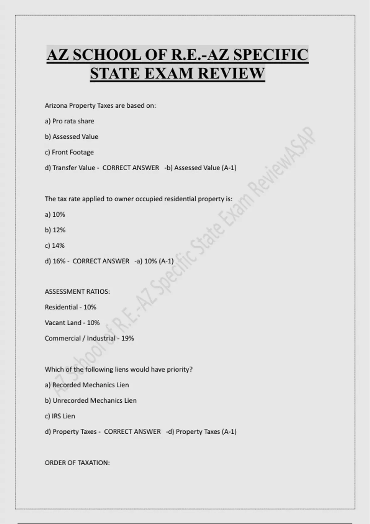 AZ SCHOOL OF R.E.-AZ SPECIFIC STATE EXAM REVIEW Arizona Property Taxes are based on: a) Pro rata share b) Assessed Value c) Front Footage d) Transfer Value - CORRECT ANSWER -b) Assessed Value (A-1) The tax rate applied to owner occupied residential property is: a) 10% b) 12% c) 14% d) 16% - CORRECT ANSWER -a) 10% (A-1) ASSESSMENT RATIOS: Residential - 10% Vacant Land - 10% Commercial / Industrial - 19% Which of the following liens would have priority? a) Recorded Mechanics Lien b) Unrecorded Mechanics Lien c) IRS Lien d) Property Taxes - CORRECT ANSWER -d) Property Taxes (A-1) ORDER OF TAXATION: