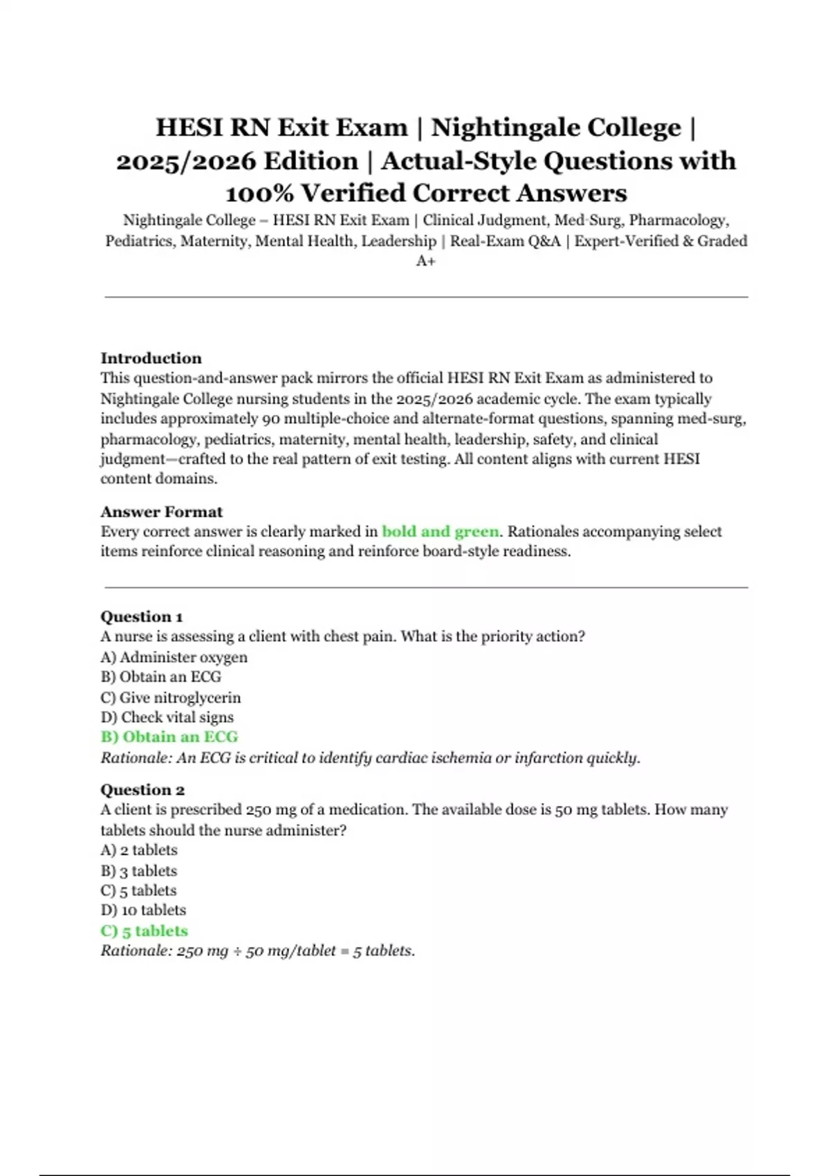 Nightingale College – HESI RN Exit Exam | Clinical Judgment, Med‑Surg, Pharmacology,