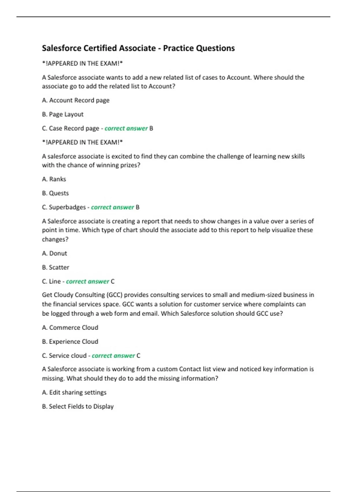 *!APPEARED IN THE EXAM!* A Salesforce associate wants to add a new related list of cases to Account. Where should the associate go to add the related list to Account? A. Account Record page B. Page Layout C. Case Record page - correct answer B *!APPEARED IN THE EXAM!* A salesforce associate is excited to find they can combine the challenge of learning new skills with the chance of winning prizes? A. Ranks B. Quests C. Superbadges - correct answer B A Salesforce associate is creating a report that needs to show changes in a value over a series of point in time. Which type of chart should the associate add to this report to help visualize these changes? A. Donut B. Scatter C. Line - correct answer C