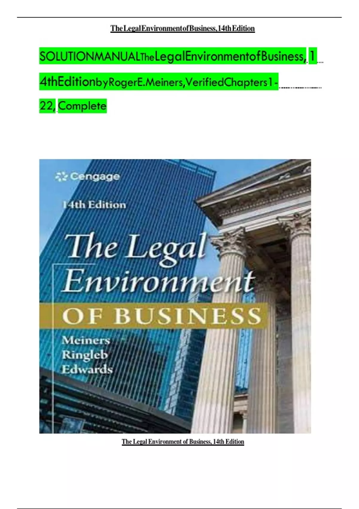 Explore the comprehensive Solution Manual for The Legal Environment of Business, 14th Edition by Roger E. Meiners. This guide includes verified answers to discussion questions, case analyses, and ethics scenarios from all 22 chapters. Perfect for students and professionals, it covers key topics like contracts, torts, intellectual property, employment law, and more. Enhance your understanding of business law with detailed explanations and real-world case studies. Ideal for exam preparation and coursework reference.