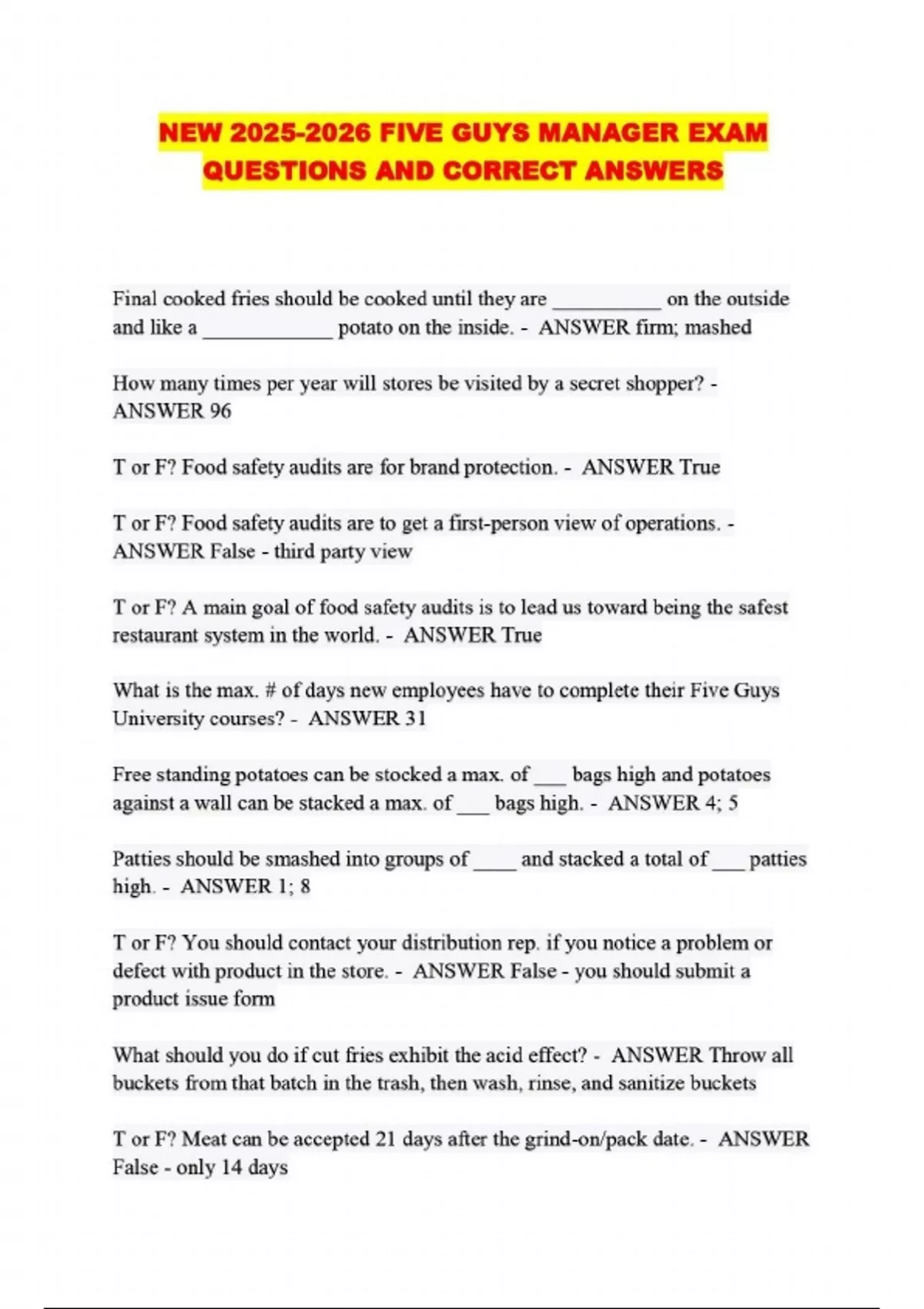 NEW FIVE GUYS MANAGER EXAM QUESTIONS AND CORRECT ANSWERS