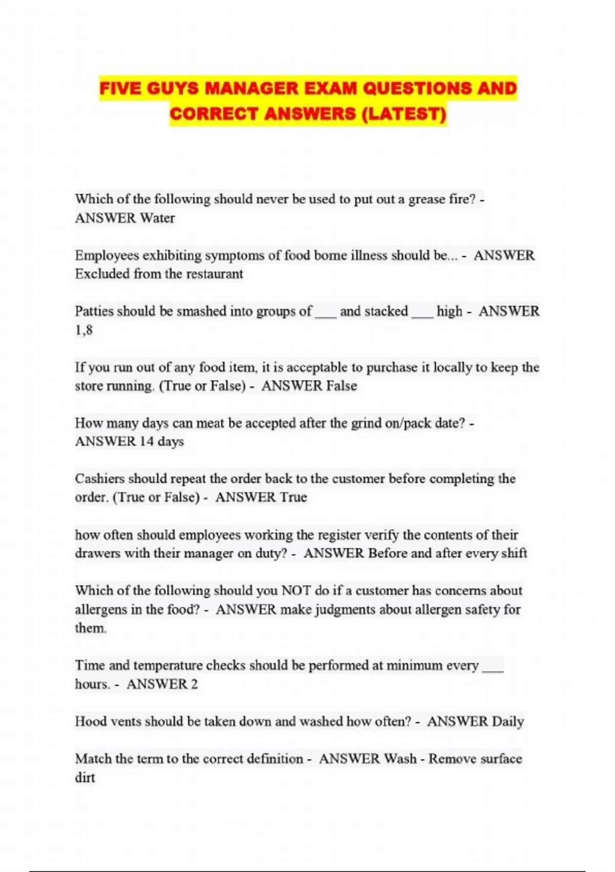 FIVE GUYS MANAGER EXAM QUESTIONS AND CORRECT ANSWERS (LATEST)