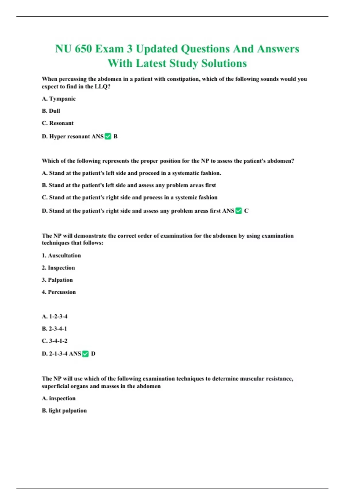 The NP will demonstrate the correct order of examination for the abdomen by using examination