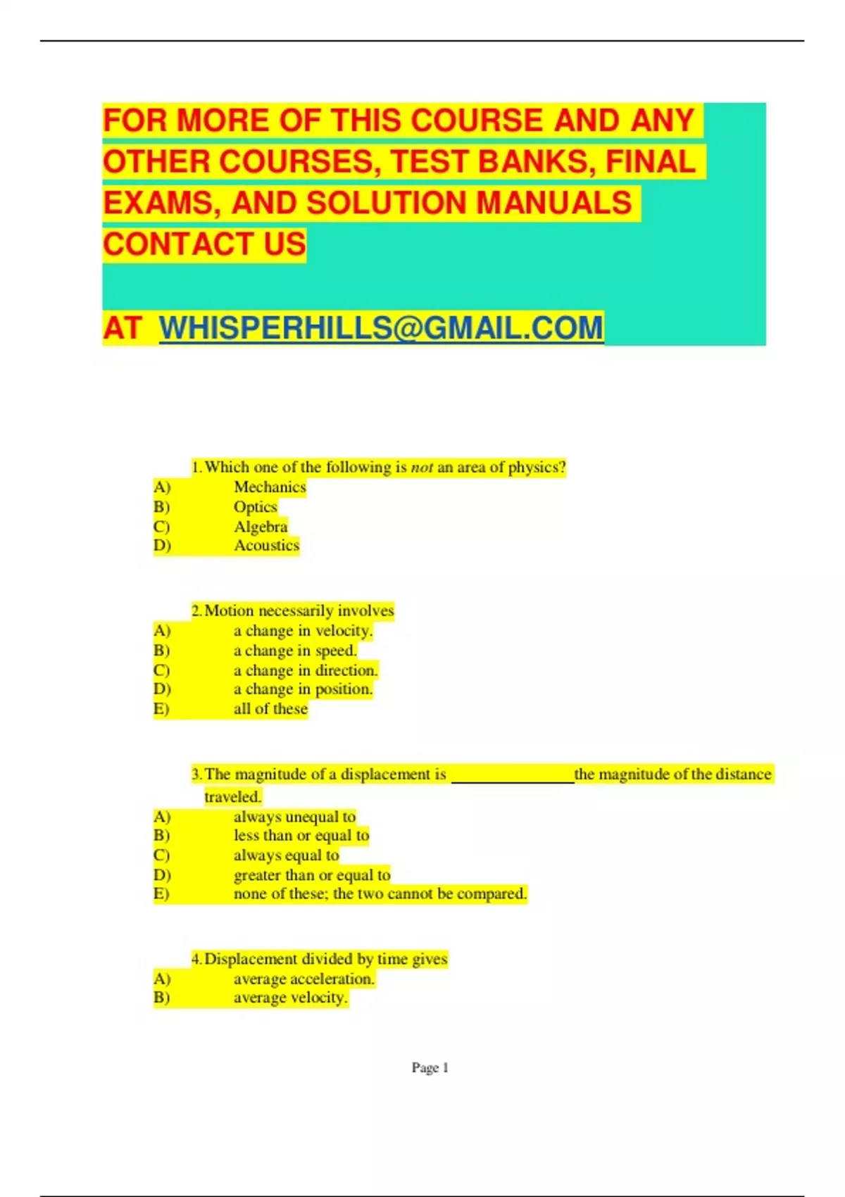 1. Which one of the following is not an area of physics? A) Mechanics B) Optics C) Algebra D) Acoustics 2. Motion necessarily involves A) a change in velocity. B) a change in speed. C) a change in direction. D) a change in position. E) all of these 3. The magnitude of a displacement is the magnitude of the distance traveled. A) always unequal to B) less than or equal to C) always equal to D) greater than or equal to E) none of these; the two cannot be compared. 4. Displacement divided by time gives A) average acceleration. B) average velocity. C) average speed. D) average distance. 5. Average speed multiplied by time gives A) average acceleration. B) displacement. C) instantaneous speed. D) distance. 6. Distance covered per unit of time is called A) speed. B) acceleration. C) velocity. D) displacement. 7. The straight-line distance and direction between two points are, together, called A) velocity. B) displacement. C) distance. D) acceleration. 8. The magnitudes of two horizontal displacements are 1 m and 9 m, respectively. Given that the vectors may be in either the plus or the minus direction, they cannot be added together to give a total displacement of A) 10 m. B) –8 m. C) 8 m. D) 9 m. E) 7 m. 9. A speedometer indicates if the automobile is traveling forward. A) instantaneous acceleration B) instantaneous speed C) instantaneous velocity D) average speed E) average acceleration
