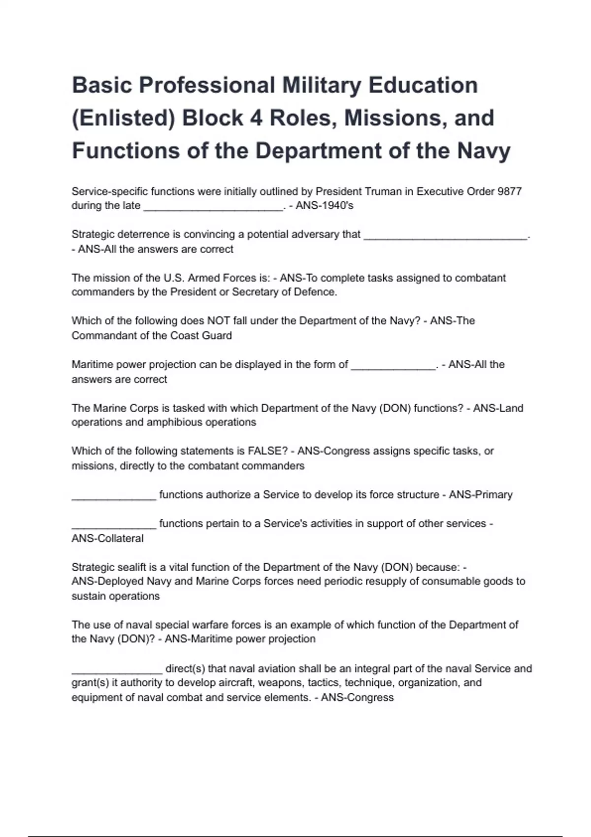 Basic Professional Military Education (Enlisted) Block 4 Roles, Missions, and Functions of the Department of the Navy questions and answers graded A+ 2025/2026