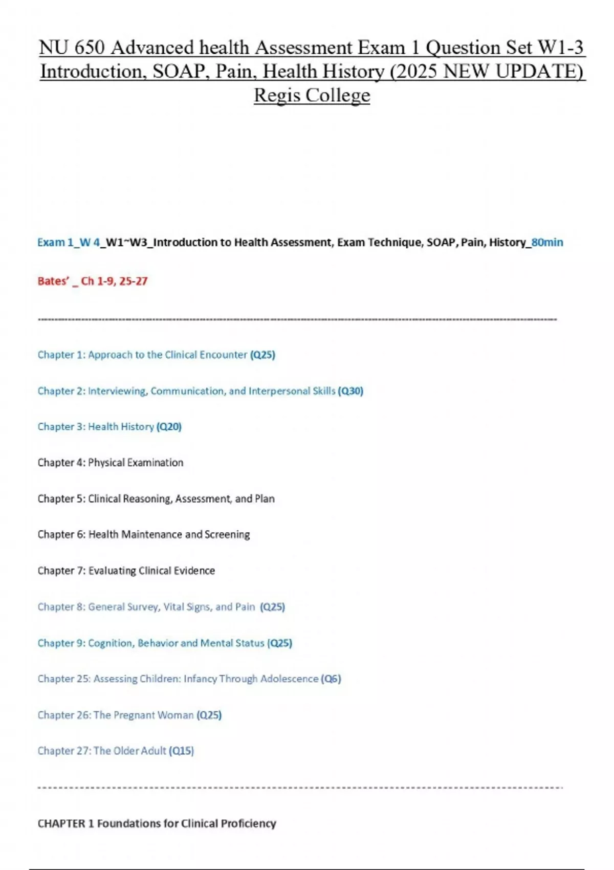 NU 650 Advanced health Assessment Exam 1 Question Set W1-3 Introduction, SOAP, Pain, Health History (2025 NEW UPDATE) Regis College