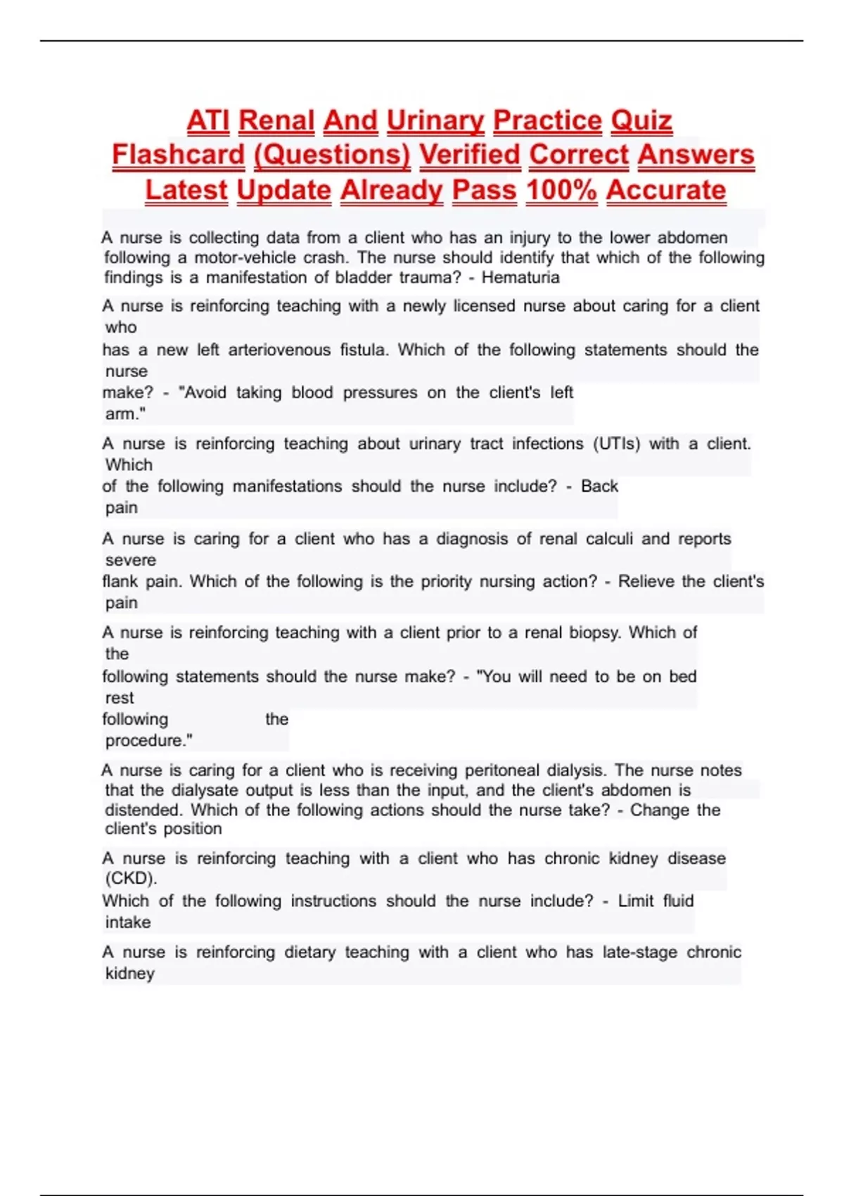ATI Renal And Urinary Practice Quiz Flashcard (Questions) Verified Correct Answers Latest Update Already Pass 100% Accurate ATI Renal And Urinary Practice Quiz Flashcard (Questions) Verified Correct Answers Latest Update Already Pass 100% Accurate ATI Renal And Urinary Practice Quiz Flashcard (Questions) Verified Correct Answers Latest Update Already Pass 100% Accurate ATI Renal And Urinary Practice Quiz Flashcard (Questions) Verified Correct Answers Latest Update Already Pass 100% Accurate ATI Renal And Urinary Practice Quiz Flashcard (Questions) Verified Correct Answers Latest Update Already Pass 100% Accurate