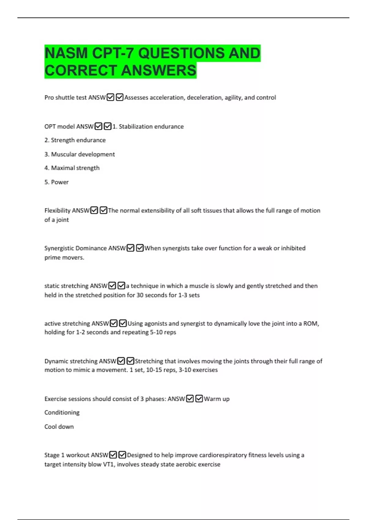 NASM CPT-7 QUESTIONS AND CORRECT ANSWERS Pro shuttle test ANSWAssesses acceleration, deceleration, agility, and control OPT model ANSW1. Stabilization endurance 2. Strength endurance 3. Muscular development 4. Maximal strength 5. Power