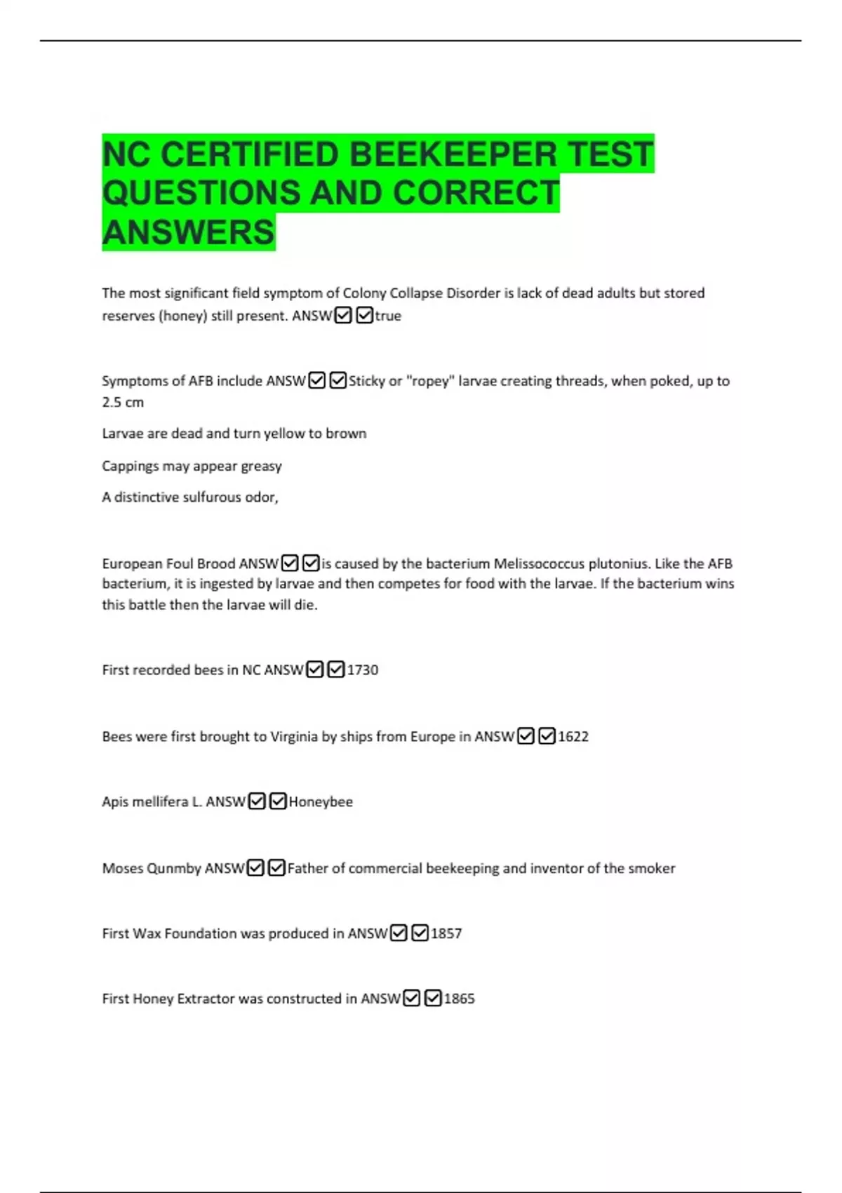 NC CERTIFIED BEEKEEPER TEST QUESTIONS AND CORRECT ANSWERS