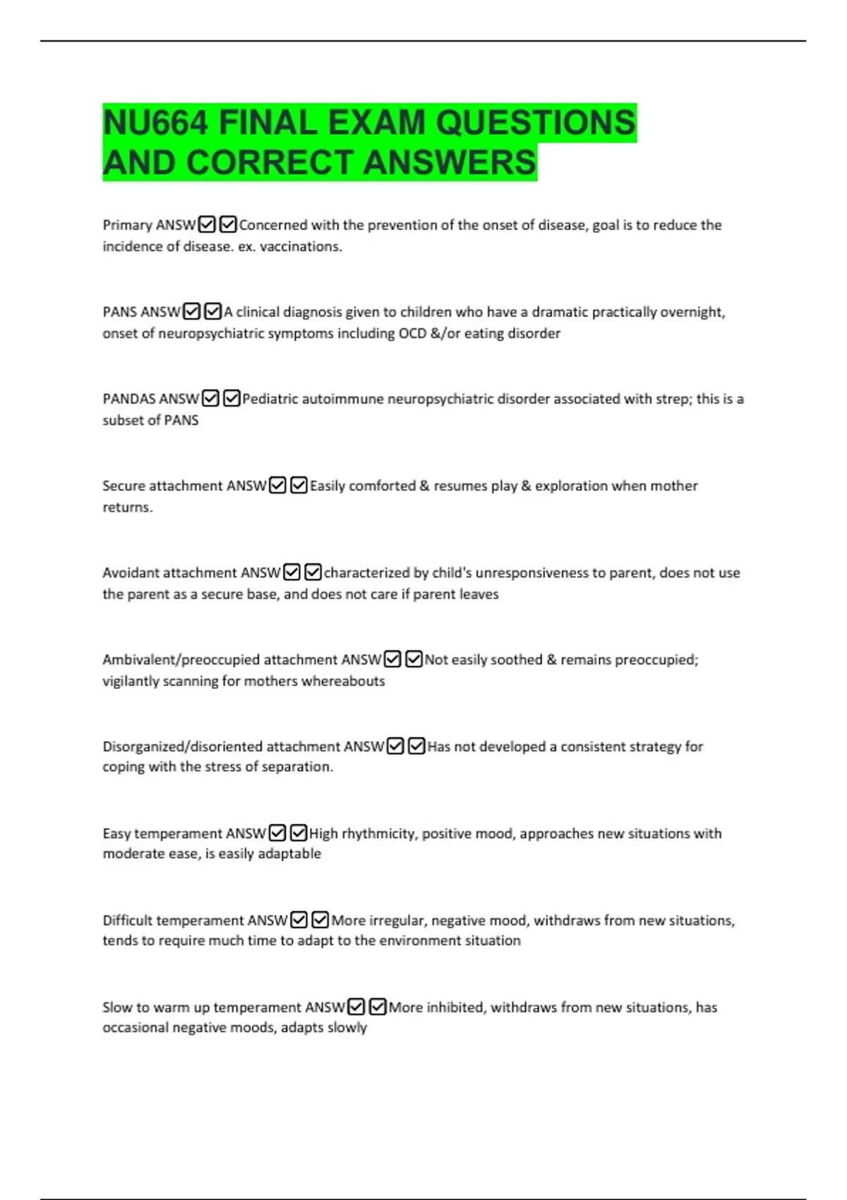 NU664 FINAL EXAM QUESTIONS AND CORRECT ANSWERS Primary ANSWConcerned with the prevention of the onset of disease, goal is to reduce the incidence of disease. ex. vaccinations. PANS ANSWA clinical diagnosis given to children who have a dramatic practically overnight, onset of neuropsychiatric symptoms including OCD &/or eating disorder
