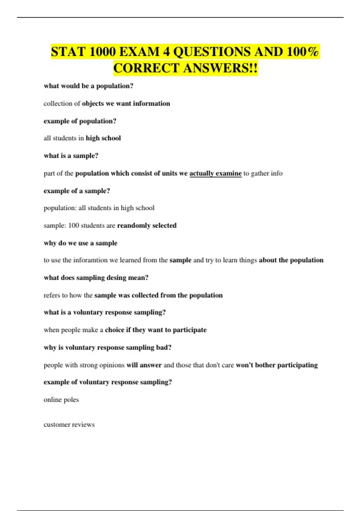 STAT 1000 EXAM 4 QUESTIONS AND 100%