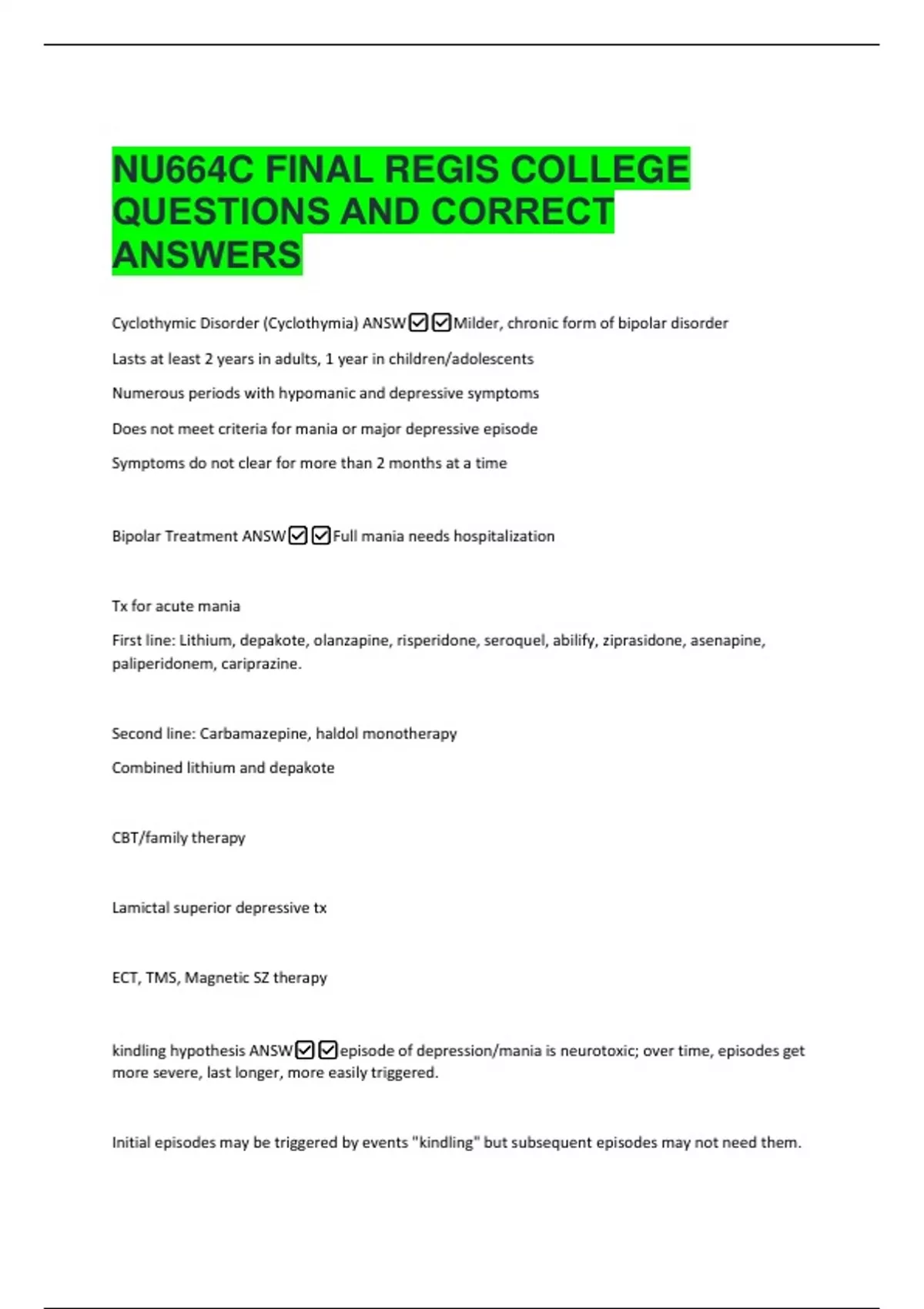 Cyclothymic Disorder (Cyclothymia) ANSW✅✅Milder, chronic form of bipolar disorder