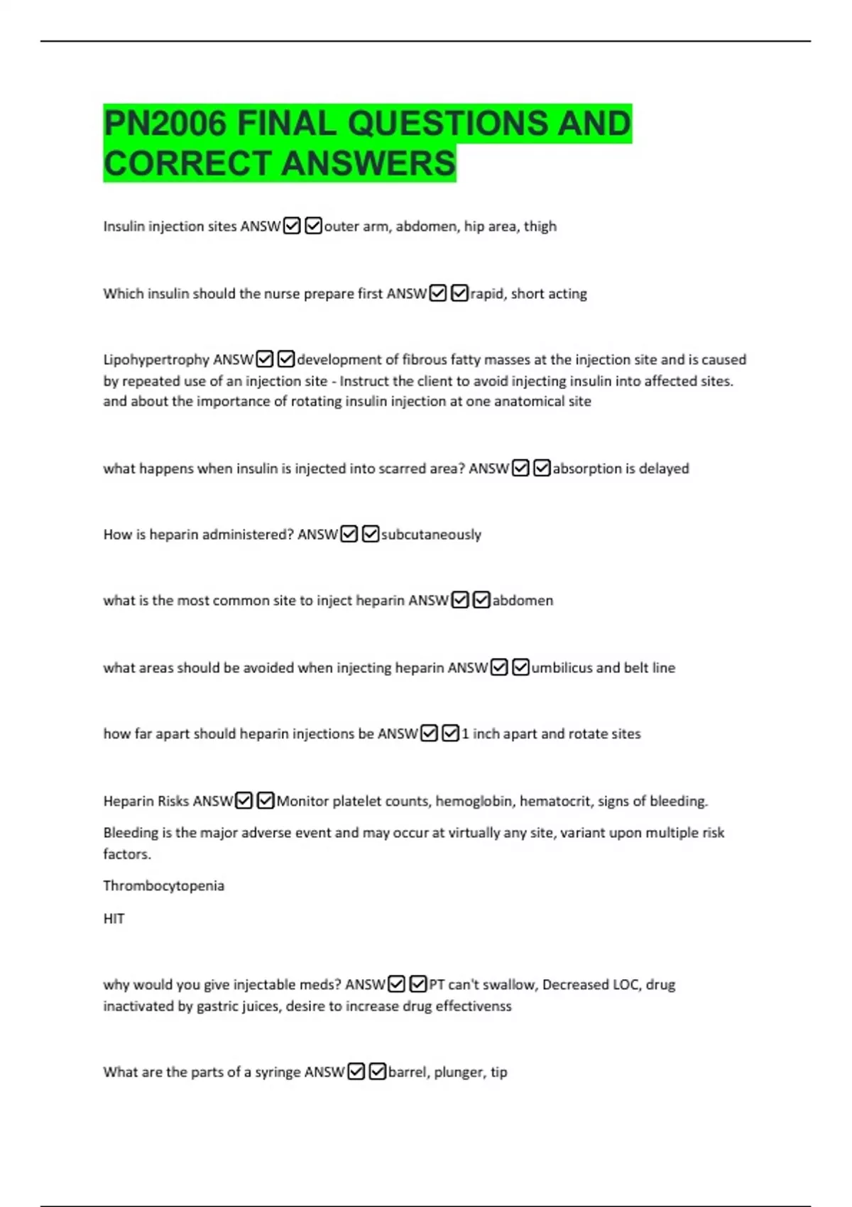 Heparin Risks ANSW✅✅Monitor platelet counts, hemoglobin, hematocrit, signs of bleeding.