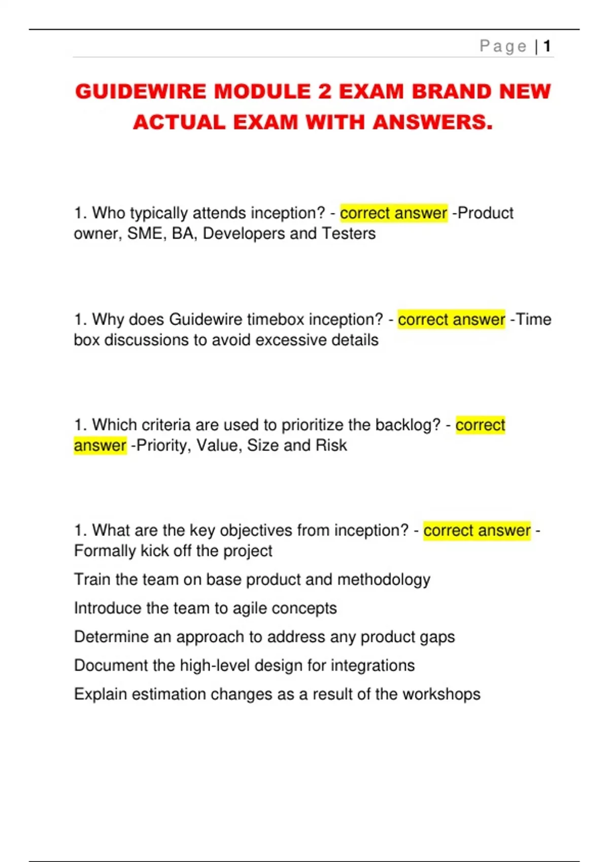 1. Why does Guidewire timebox inception? - correct answer -Time